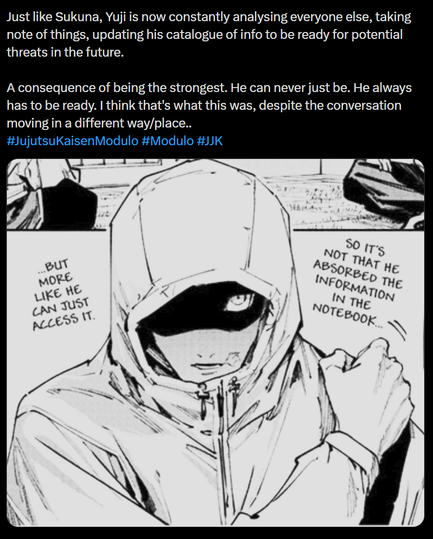 these people are so retarded. yuji hasn't acted like sukuna at all in modulo. he acts like an old ass nigga that is extremely powerful but has seen some real shit
