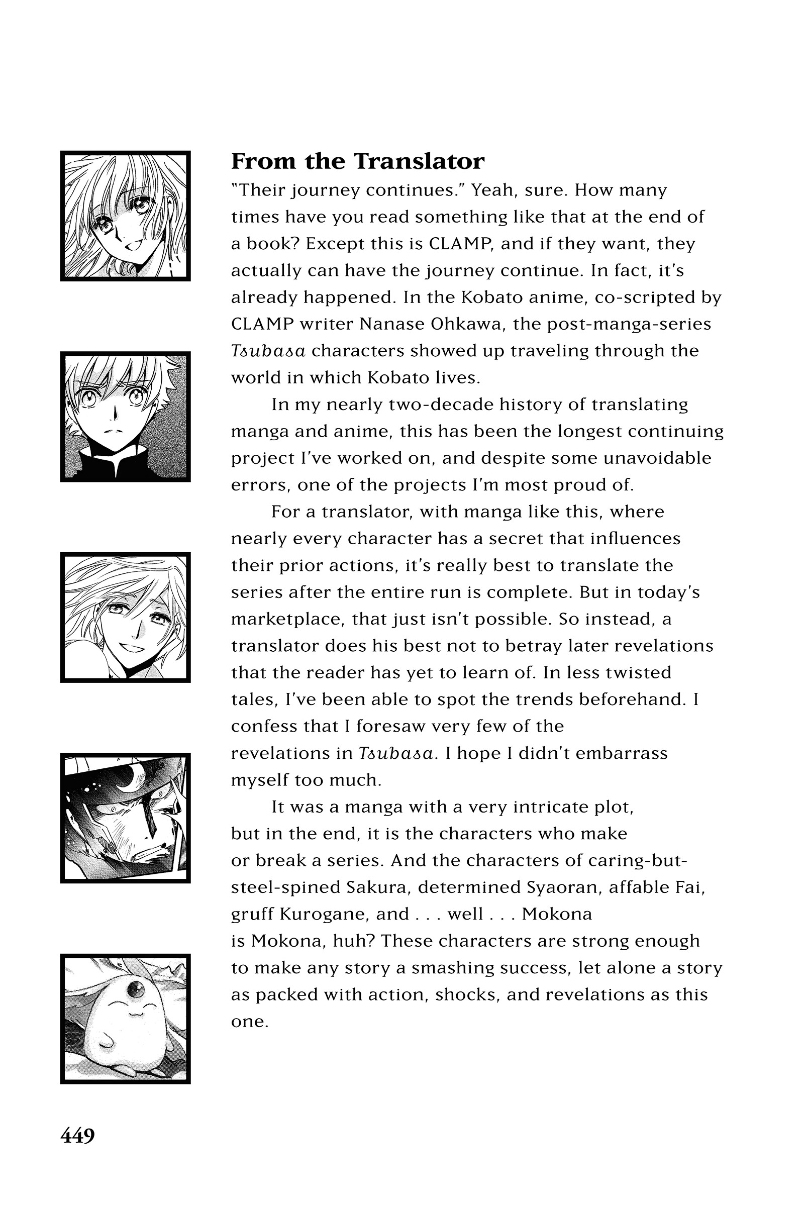 >>286267569I absolutely loved this manga, to the point of being unable to name anything I really hated. Don't know if I can name a single favorite chapter, but I especially liked the racing arc. Time and time again have I mentioned that Fai is my favorite character. I've already explained often enough why.What I like most about TRC is how it manages to have practically everything: Great art, lovable characters, a multitude of beautifully-designed worlds, mystery, action, romance, friendship, tragedy, humor, science fiction, fantasy, and the list goes on. Also, rare as this may be, I didn't mind the crossover aspect.