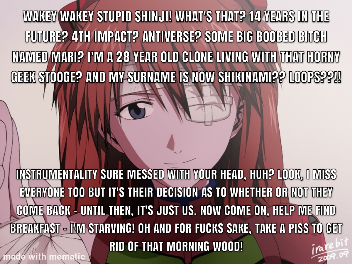 We’ll stop here, you’re a brick wall. I’m not what you think I am and neither is Asuka. But it’s alright, you can ignore this aspect of her character if you want to, and delude yourself into shadowboxing strawmen. Won’t change the series, and the new short confirming how her character was always meant to be properly read. Any further and I’d just be repeating points that you don’t understand, or don’t want to understand. Bad faith conversation isn’t worth it, I’ve been misrepresented enough.