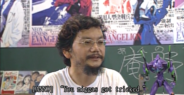 Are you being facetious? Yes, there were others helping Anno write, but ultimately it's his vision, and ultimately that vision is constrained because he was an Otaku that only knew Otaku related things.