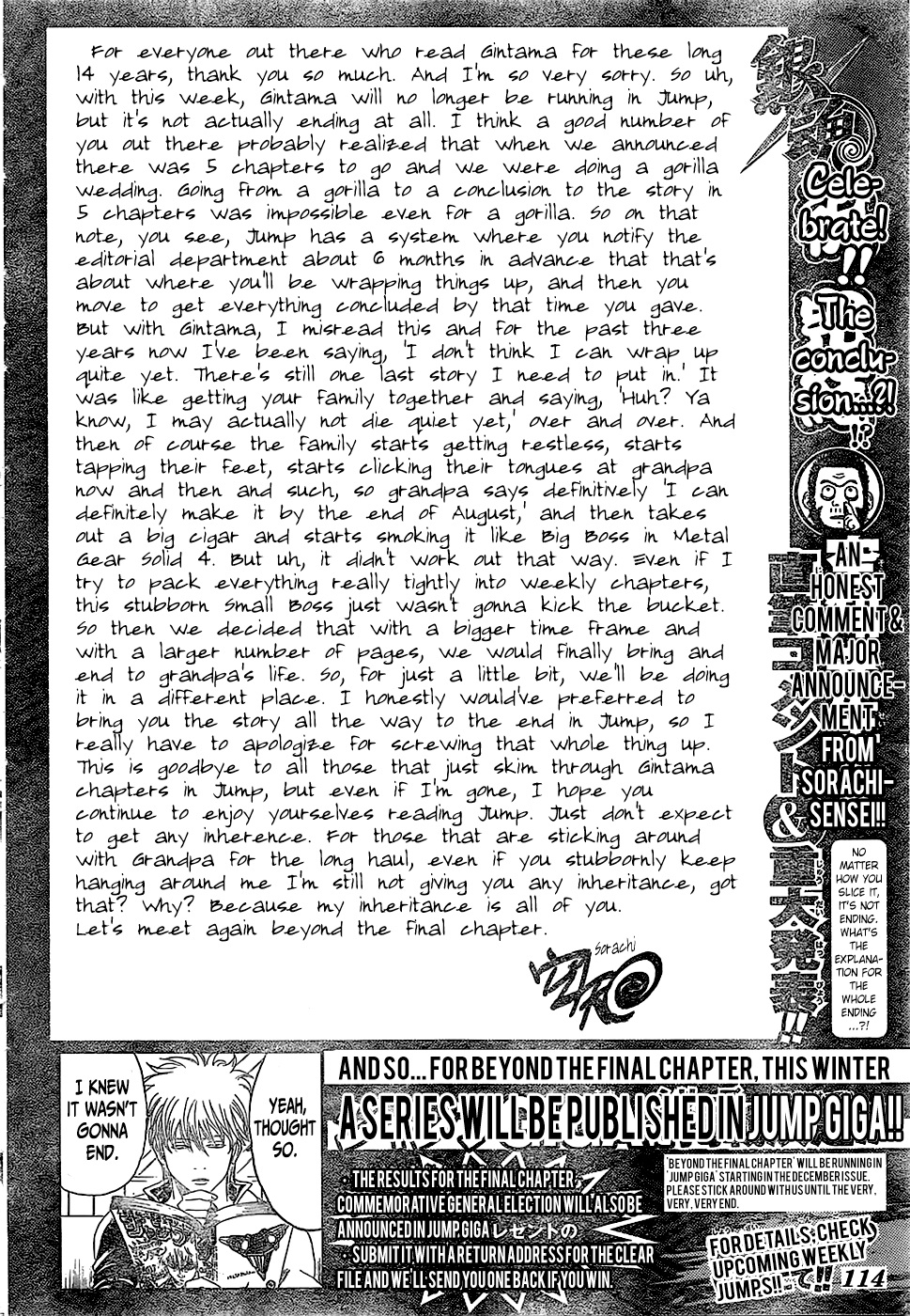 i think he told giga he would only need 3 more big chapters because the jump giga covers have the gintama cast saying o-wa-ri