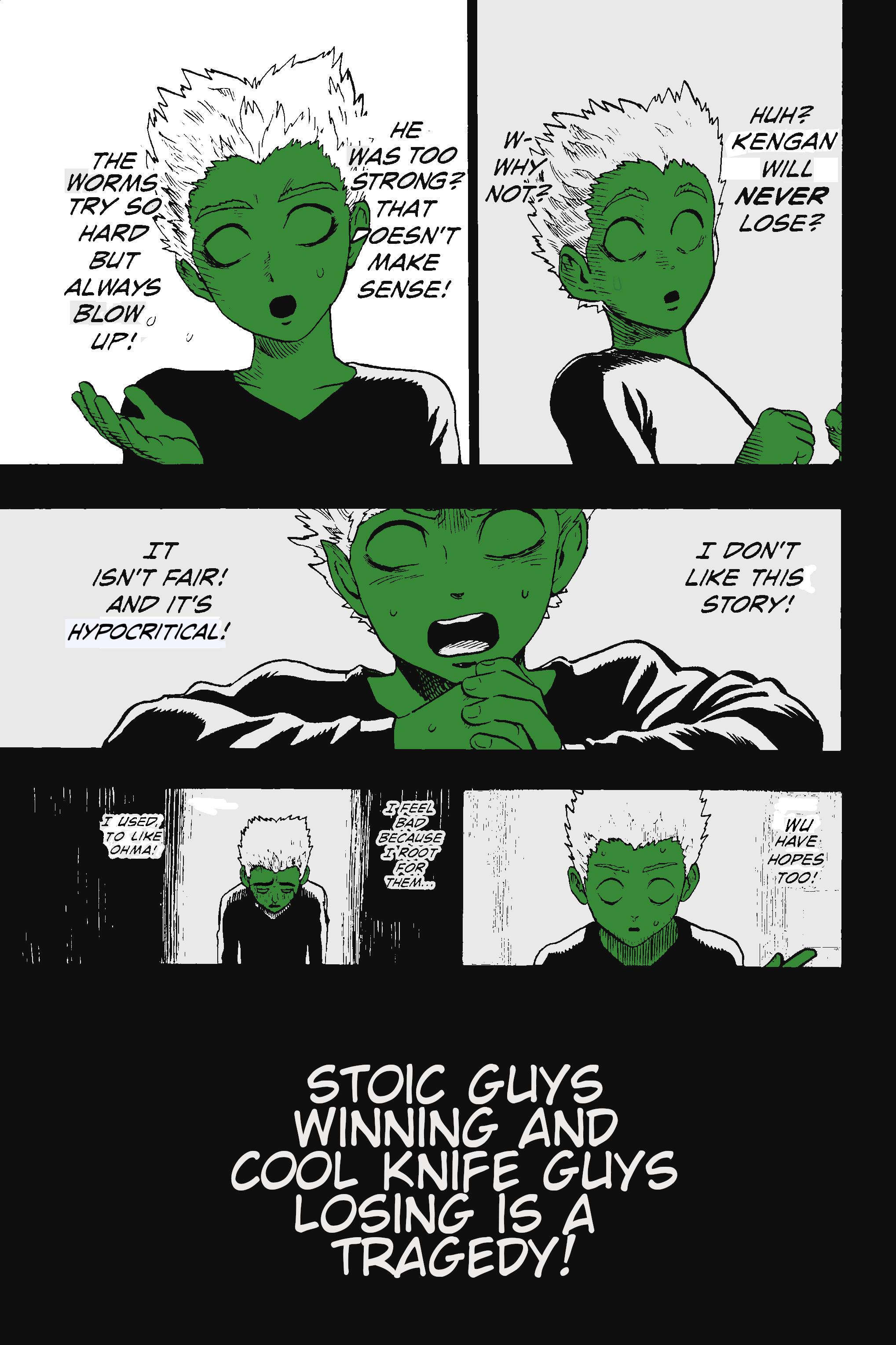 >>286336846>>286336320I don't even feel anything for them. I just hate how blatantly obvious that this is just purely filler. Sure, give us a Haruo hype fanservice page. But don't waste time trying to introduce these low effort mooks that won't survive the next chapter. Just have page 11 go straight into the action of having Haruo beating up some faceless Worm thugs.You could have cut out 3-4 of these final pages and it would have made no difference. I'm willing to bet that if someone paid a good manga editor a million dollars to edit all the fluff out of Omega so that it could be as tightly-paced as possible, that editor would easily remove at least 100+ chapters worth of pages. That's just how much filler there is in this goddamn manga.