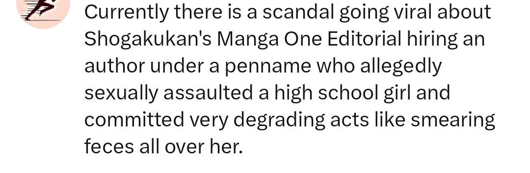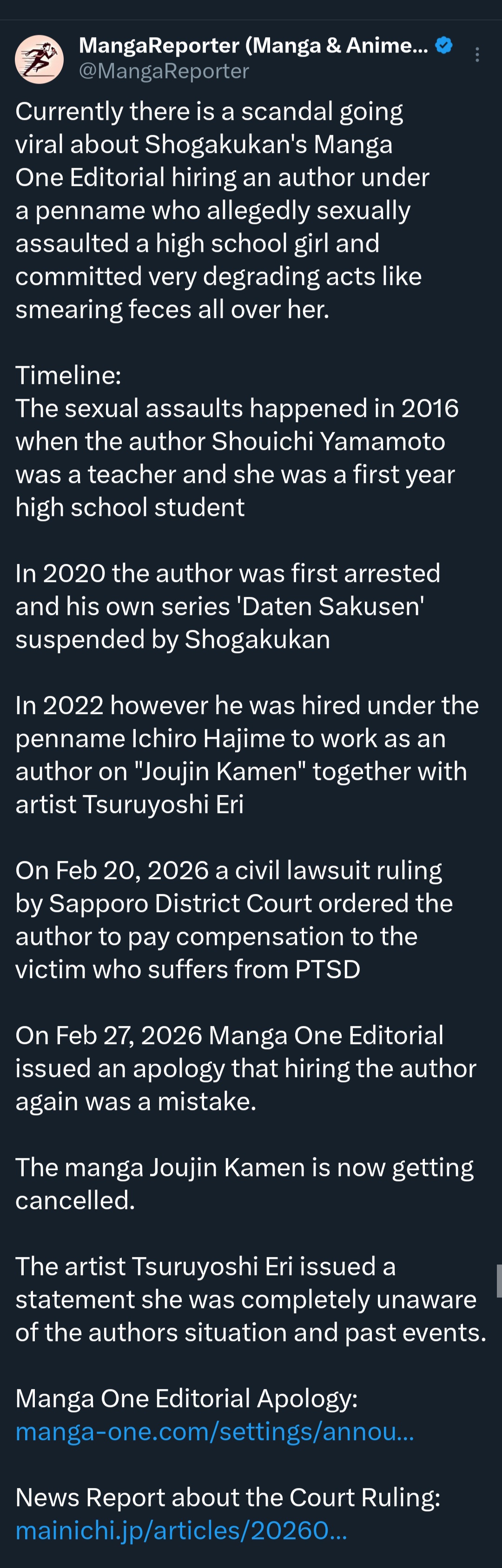 Currently there is a scandal going viral about Shogakukan's Manga One Editorial hiring an author under a penname who allegedly sexually assaulted a high school girl and committed very degrading acts like smearing feces all over her.Timeline:The sexual assaults happened in 2016 when the author Shouichi Yamamoto was a teacher and she was a first year high school studentIn 2020 the author was first arrested and his own series 'Daten Sakusen' suspended by ShogakukanIn 2022 however he was hired under the penname Ichiro Hajime to work as an author on "Joujin Kamen" together with artist Tsuruyoshi EriOn Feb 20, 2026 a civil lawsuit ruling by Sapporo District Court ordered the author to pay compensation to the victim who suffers from PTSDOn Feb 27, 2026 Manga One Editorial issued an apology that hiring the author again was a mistake. The manga Joujin Kamen is now getting cancelled. The artist Tsuruyoshi Eri issued a statement she was completely unaware of the authors situation and past events
