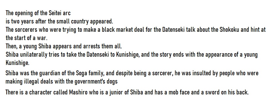 >>286377313“Seitei War Arc begins.Two years after the small nation first appeared.A group of sorcerers trying to make a black-market deal involving Datenseki talk at length about the small nation, hinting that a war is about to start.Then a young Shiba shows up and captures them all.Acting on his own judgment, Shiba decides to take the Datenseki to Kunishige.The chapter ends with the young Kunishige making his appearance.”Actually I don't know where the shiba being soga clan servant stuff came from, fujos are talking about it but I don't see any spoilers about it. Sorry lmao