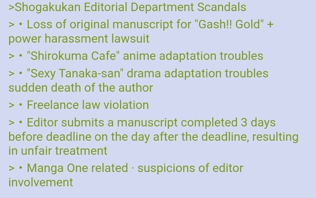 >>286431543In 2024, Shogakukan's manga artist, Hinako Ashihara, committed suicide after being bullied by Shogakukan.In January 2025, Shogakukan's Detective Conan was boycotted in China for allegedly making anti-Chinese remarks.In March 2025, Shogakukan was again embroiled in a sex scandal.