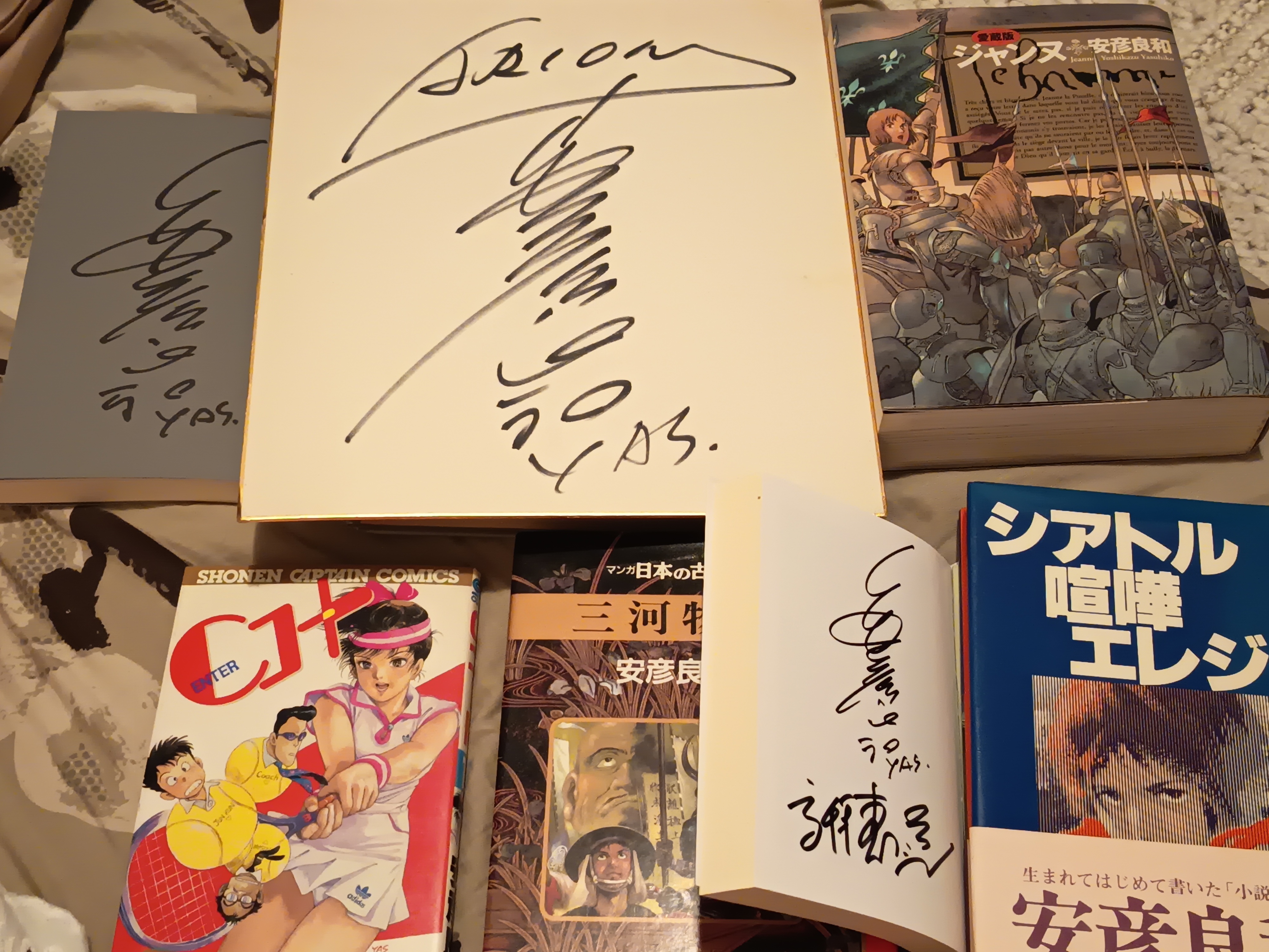 Haven't made a haul post in a while First all first editionsSigned curucoz's island back pages (reprint release Seattle fight elegyJeanne C cot三河物語Arion signed magazine bonusCrusher Joe signed by yas and the author