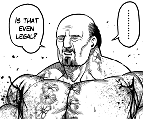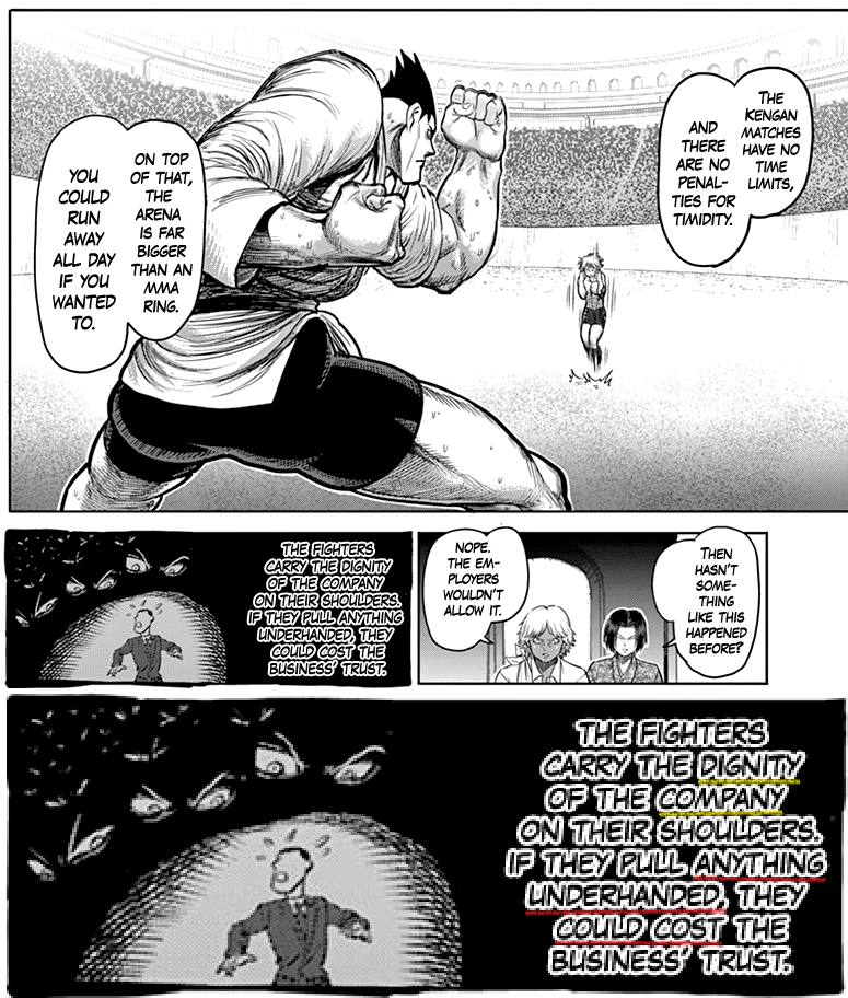 >>286478323>Win?>At any cost!?>The underground colloborative association known as "Kengan" that hires murderous felons and psychopathic killers to represent their companies so they can have better chances when gambling their clients' resources for more resources...>...would NEVER do that!!!>This manga is FOUNDED on their high values and honorable activities! The author consistently shows you, and tells you, that!|: