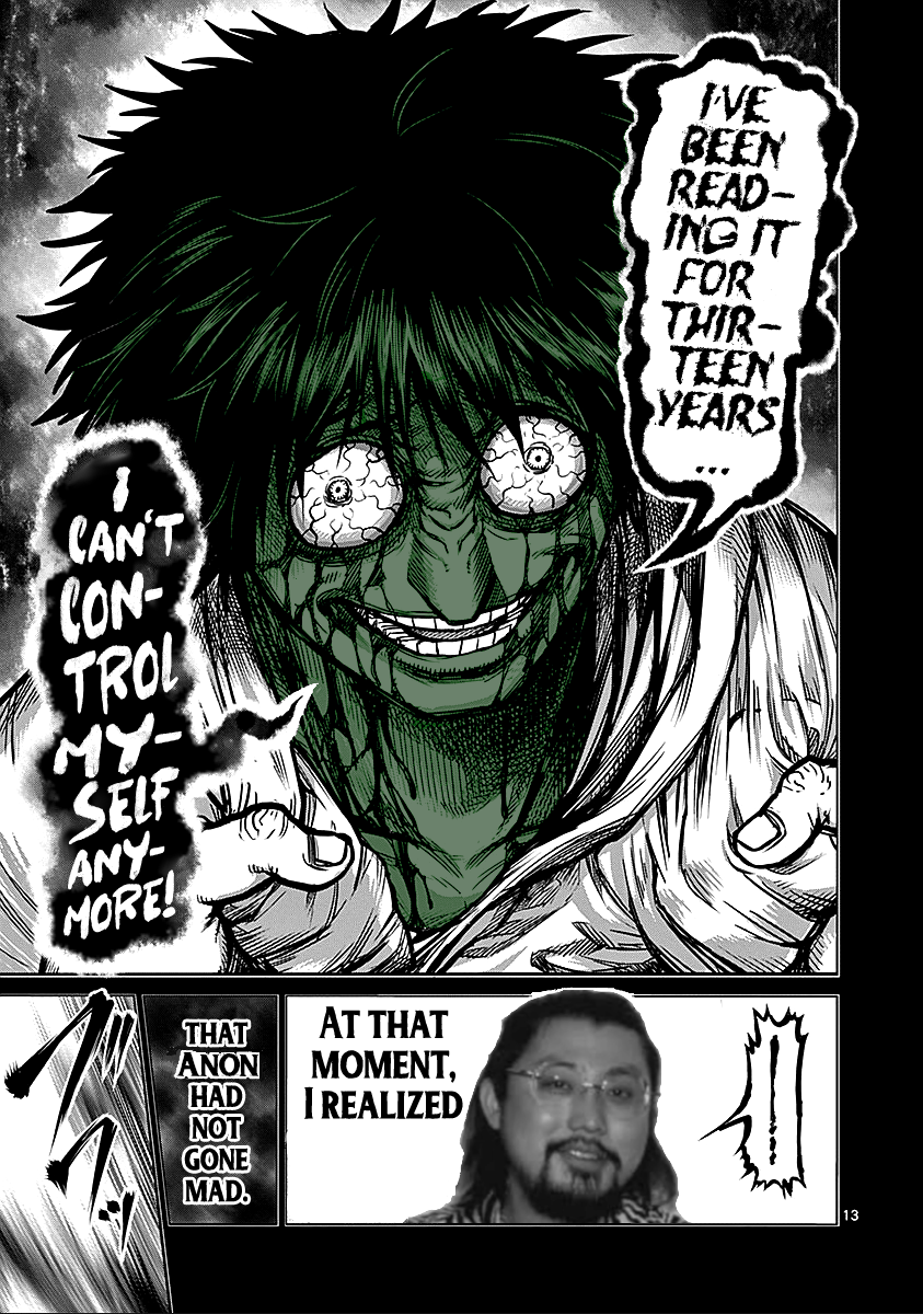 I can't begin to fathom taking something as goofy as kengan seriously enough to get mad about it. And I don't mean to say it's bad at all, the characters are fun, the fights are really cool, and the art is great a lot of the time. But there are people in these threads frequently making really angsty, irate, passive-aggressive posts about how they hate X character, or how Y subplot really sucks, like they're outraged. Dude, the main character beats his heart manually and turns brown to punch harder. Just let it go.