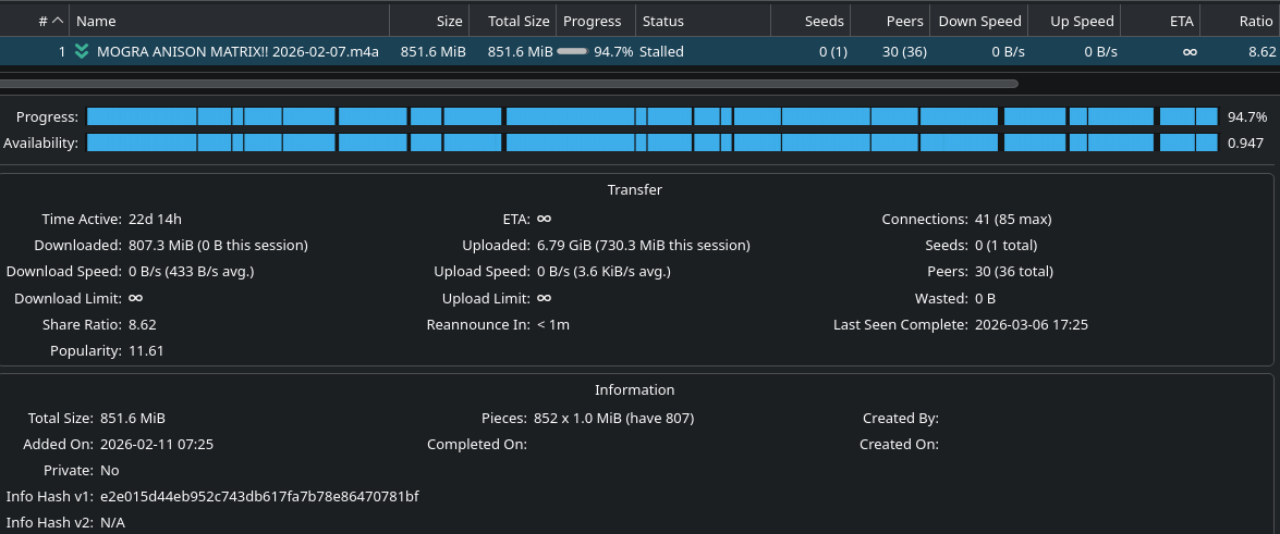 >>286558987Thanks anonBeing stuck at 94.72% across all peers was just getting a bit silly