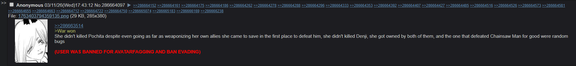 I'm so glad Denji got the bad end. Just last chapter anons were saying "IT'S FINE DENJI LOVES BOTH ASA AND YORU" after Denji saved Yoru just because he wanted to have sex with her. Like they totally thought it was normal and deserved Denji should have two girlfriends, (not even a girlfriend, just sex friends) even a harem and Pochita and Fujimoto destroyed them. Yoru was kicking decapitated heads, and they were like, so beautiful Denji loves Yoru, Asa should share her body with Yoru forever. Denji earned the sex.