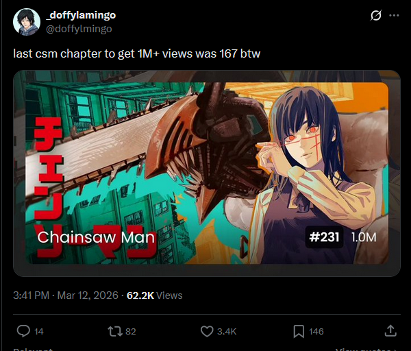 It would make sense though to end Part 2, let Fujimoto have a break from Chainsaw Man, and have Part 3 return around the same time the International Assassins Arc adaptation releases. Intentionally capitalise off of it's popularity instead of accidentally having half a million new readers arrive in the middle of a frustratingly paced arc.