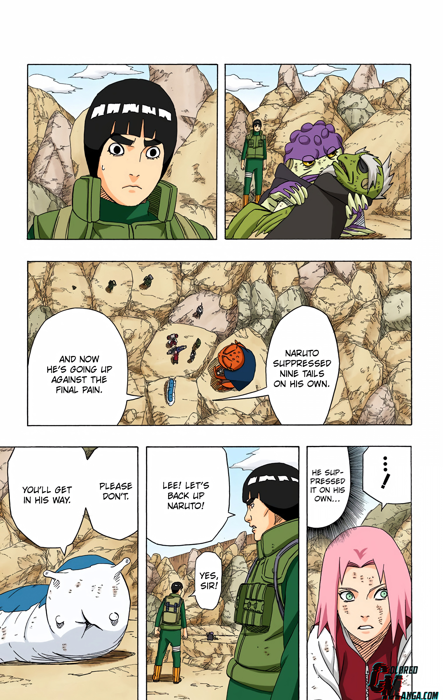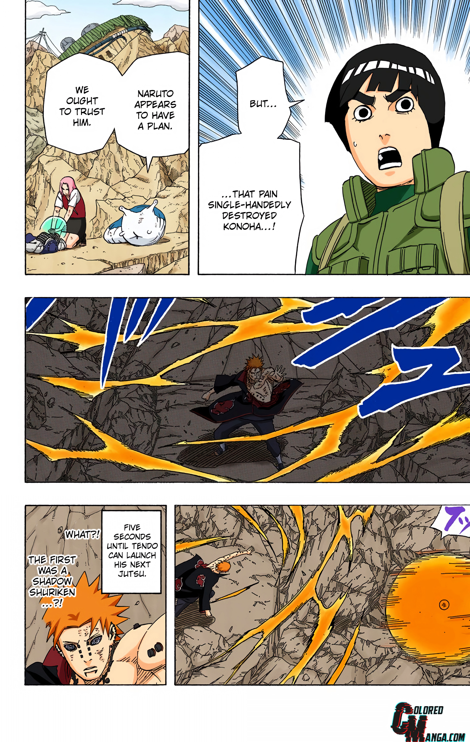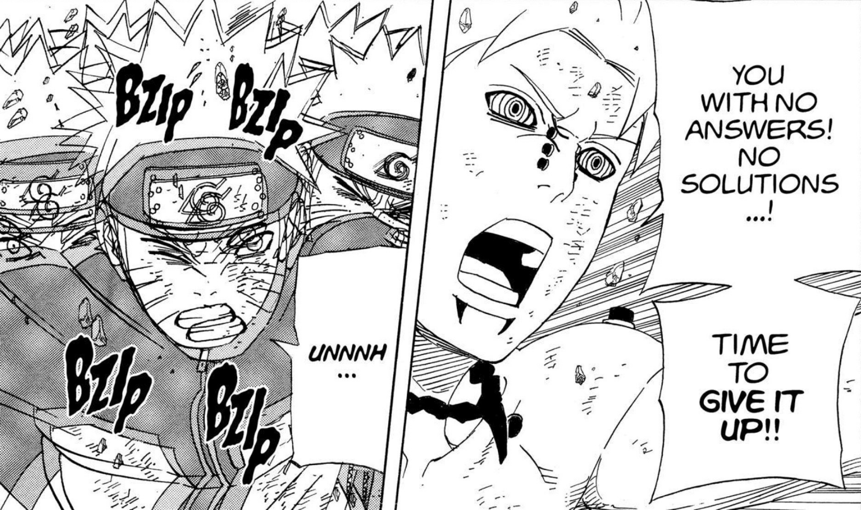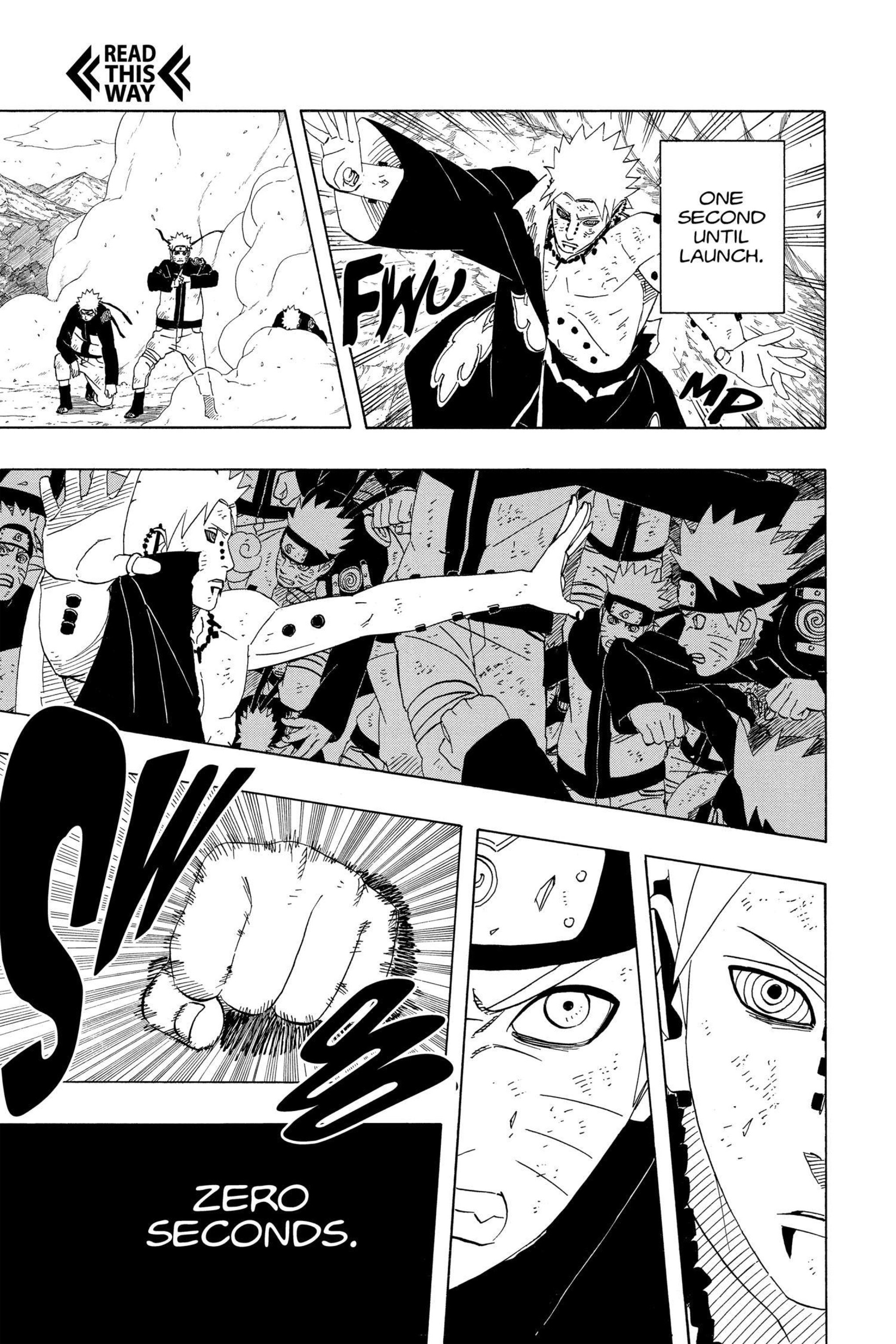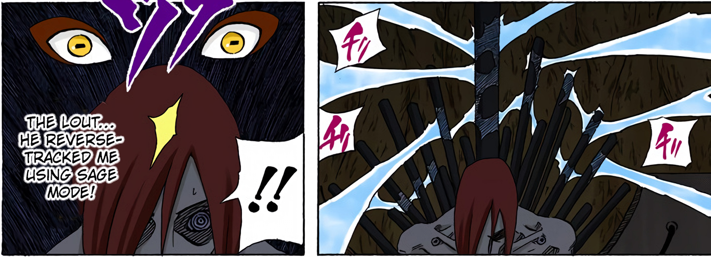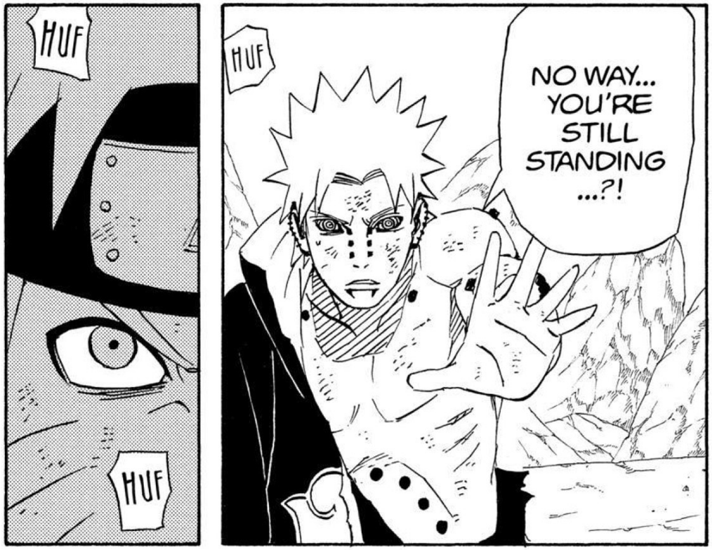 >>286687515> you'll get in his wayLMFAO. Can't even say this was due to a lack of planning, we have known about the 8 gates since the chunin exam. I'm not confident the six paths could have taken Guy with 7 gates.Also, Lee lookin at those frogs like "who are these guys" kek>>286687566>>286687582hard to tell what's happening here. No, I don't need anyone to explain it.>>286687629>>286687655This is dumb and impossible for Pain not to notice, but I think it's funny how it's the exact same bullshit Kakashi pulled so I'm letting it pass.>>286687705This however is the bad kind of dumb and does not get a pass. Tendo blew the giant frogs halfway across the country, no way you can resist the push like this.>>286687724Someone else said the bottom panel should have been Konoha ninja holding him up instead of clones, and I wholeheartedly agree. That would be actual theming, and it would make Tsunade keeping everyone alive purposeful.>>286687749What a terrible way to end the fight. Konohamaru could have dodged this. Just another specific scene Kishi wanted to draw, with no natural progression.
