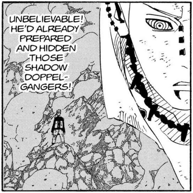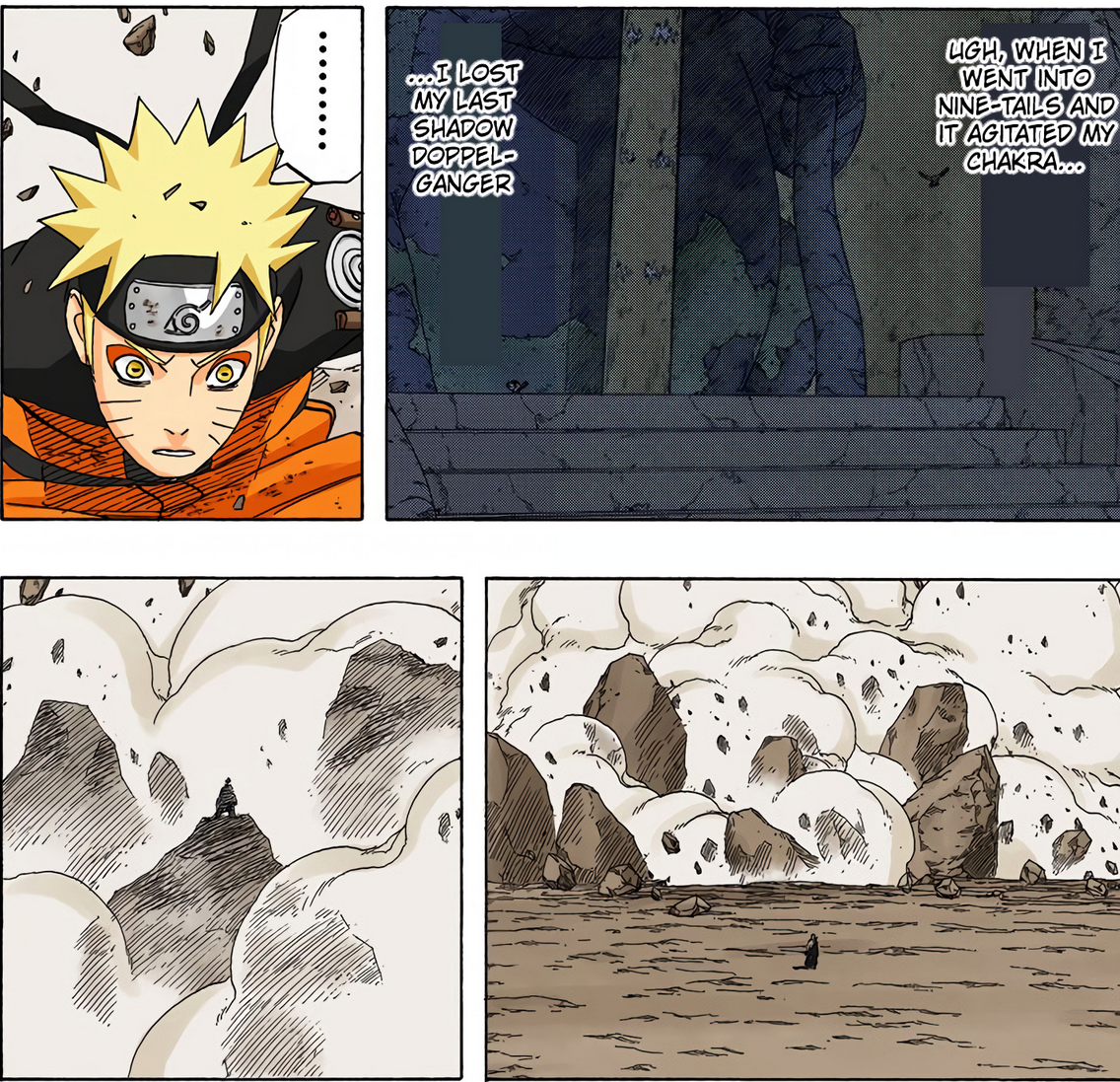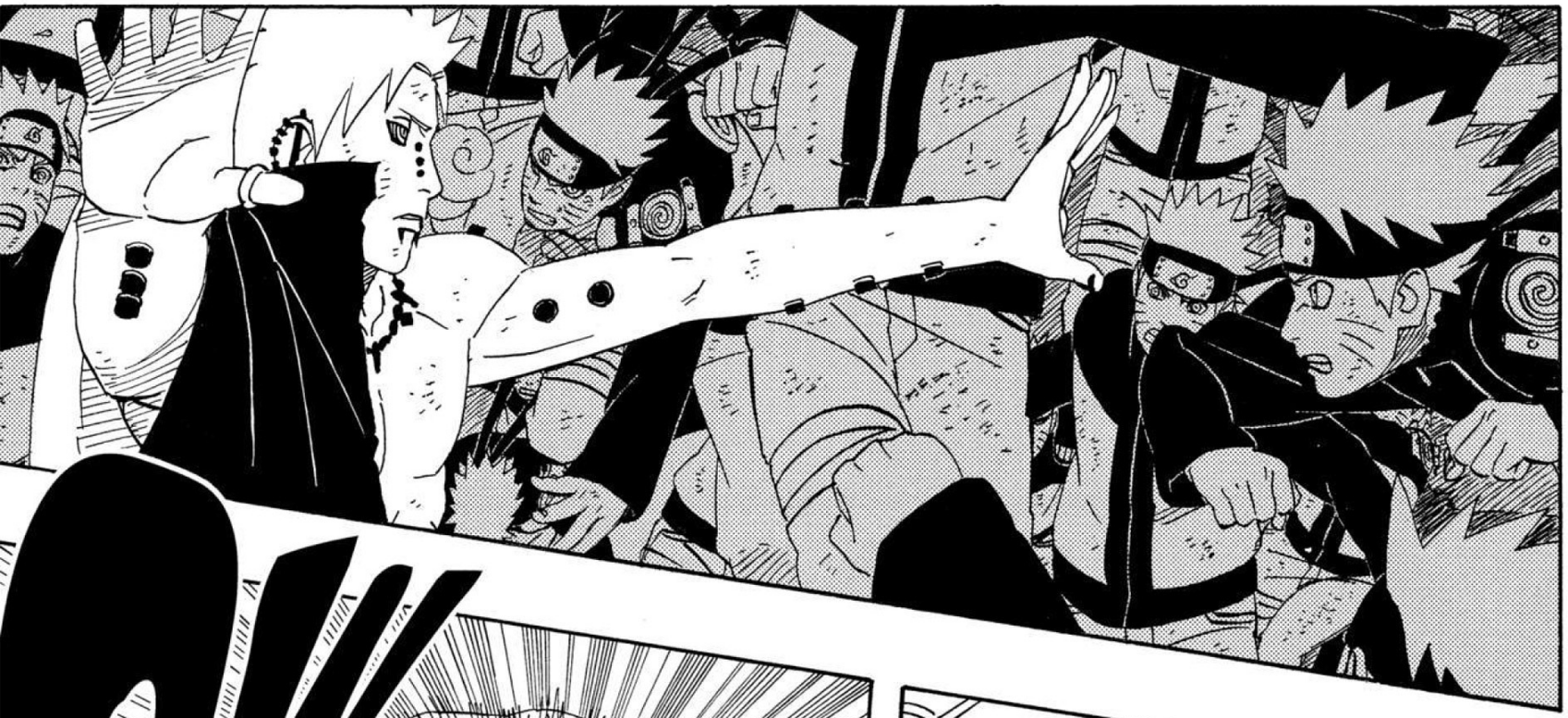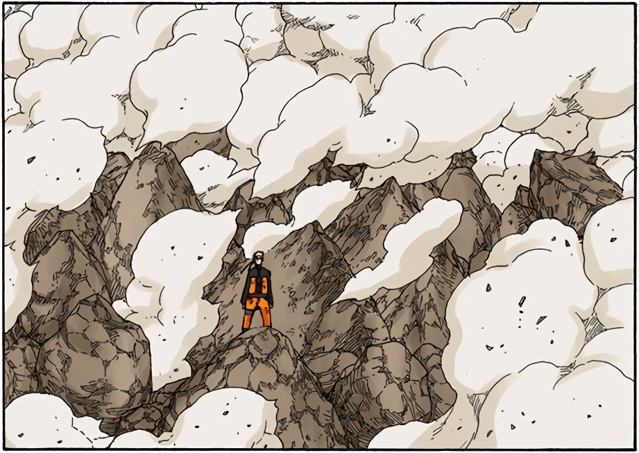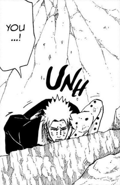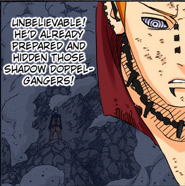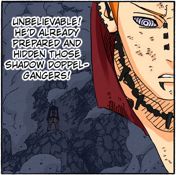 >>286690681>>286690661"............" is implying he's deep in thought. The next two panels focus heavily on the smoke and Naruto standing in it alongside the falling rocks and debris. This is further confirmed by this panel that is showing Naruto standing in the smoke, meaning Pain is explicitly telling the reader this is when Naruto made his clones.