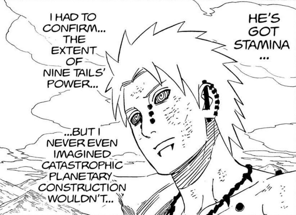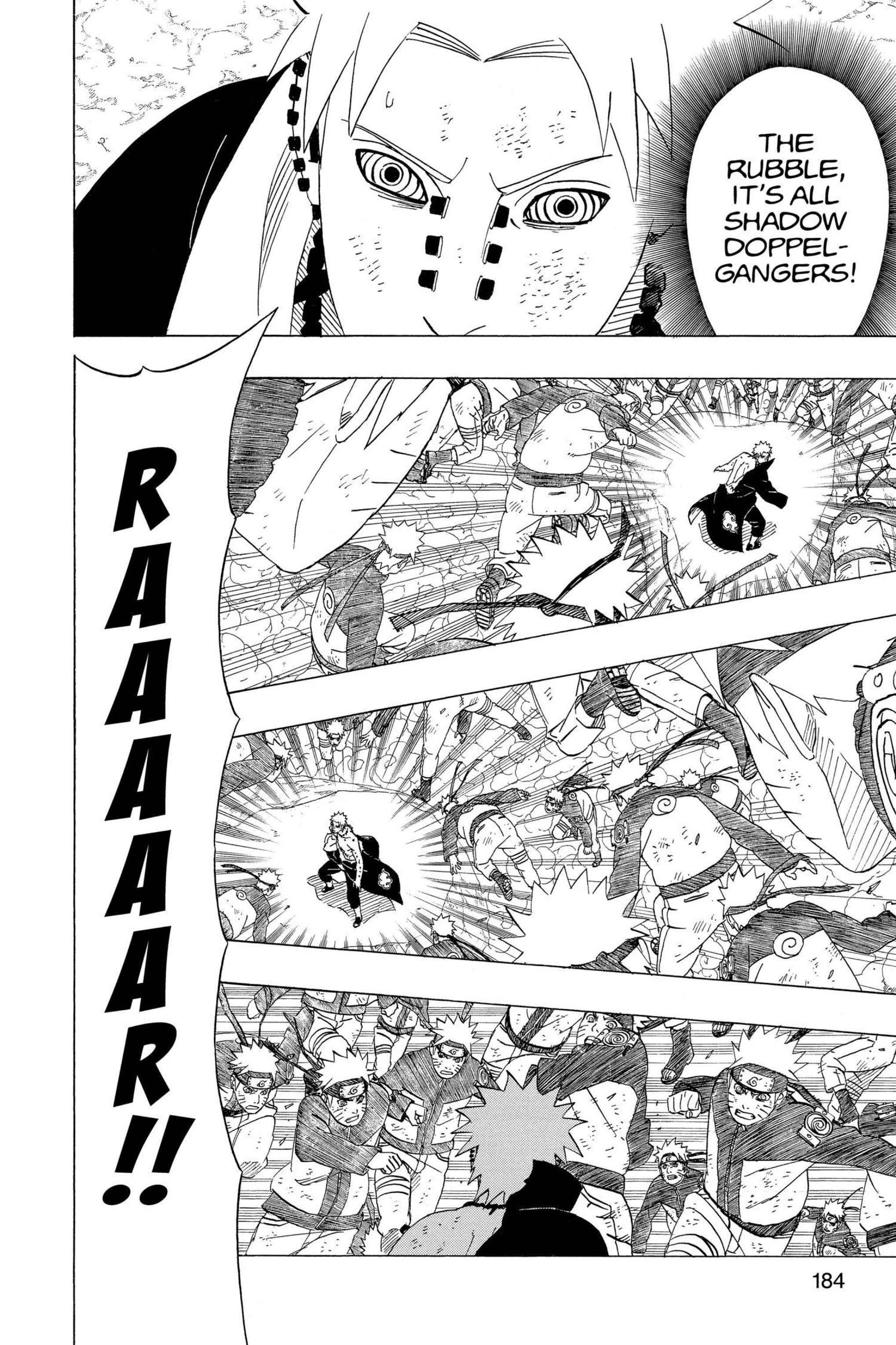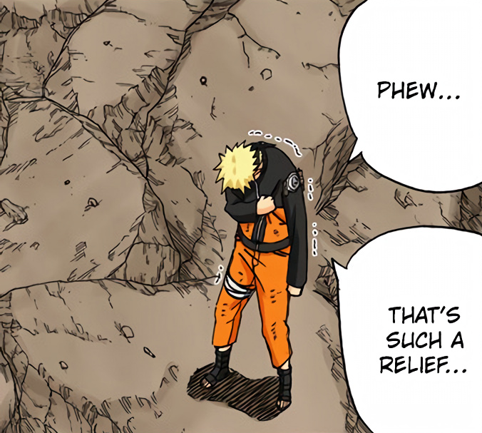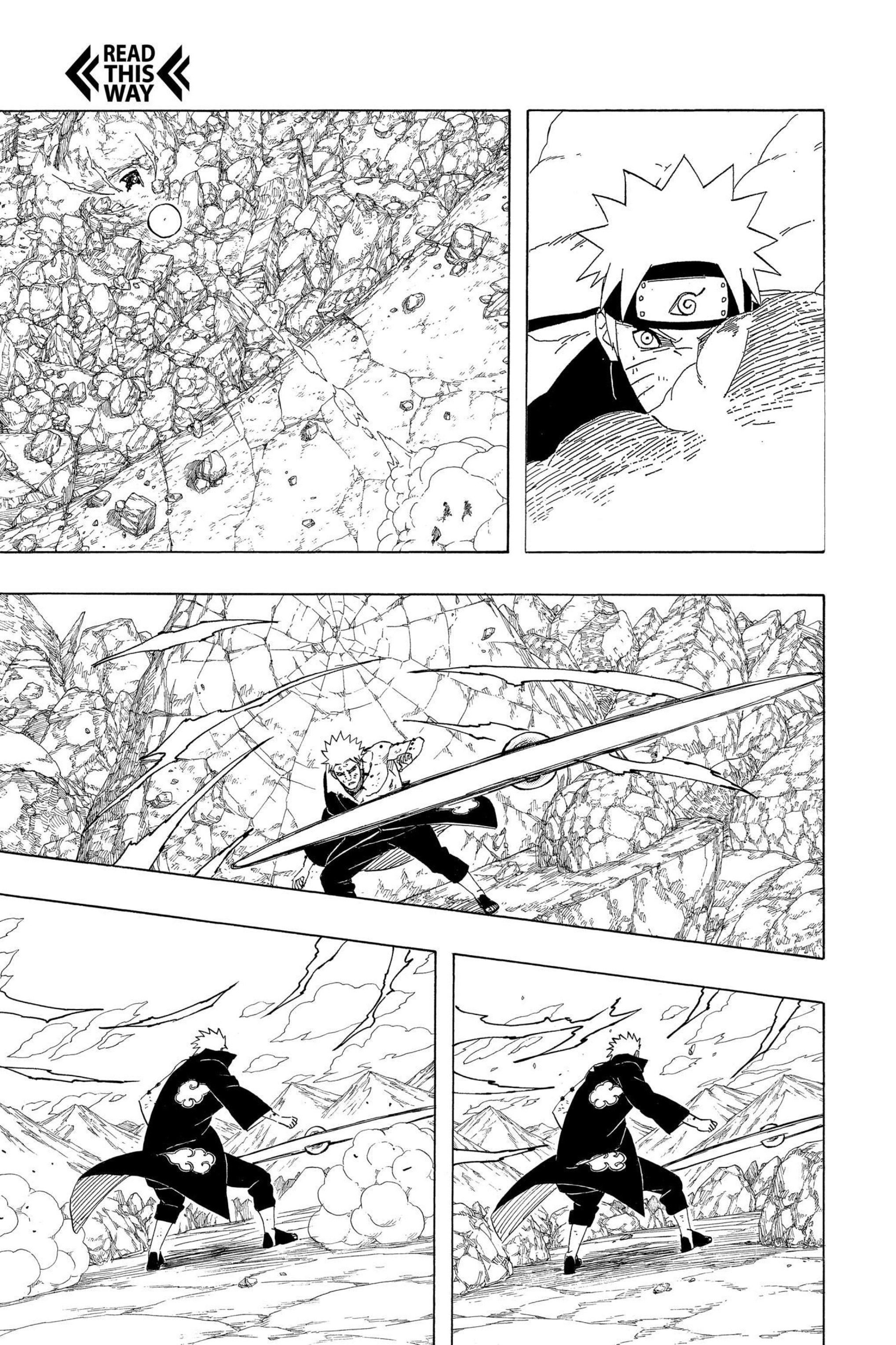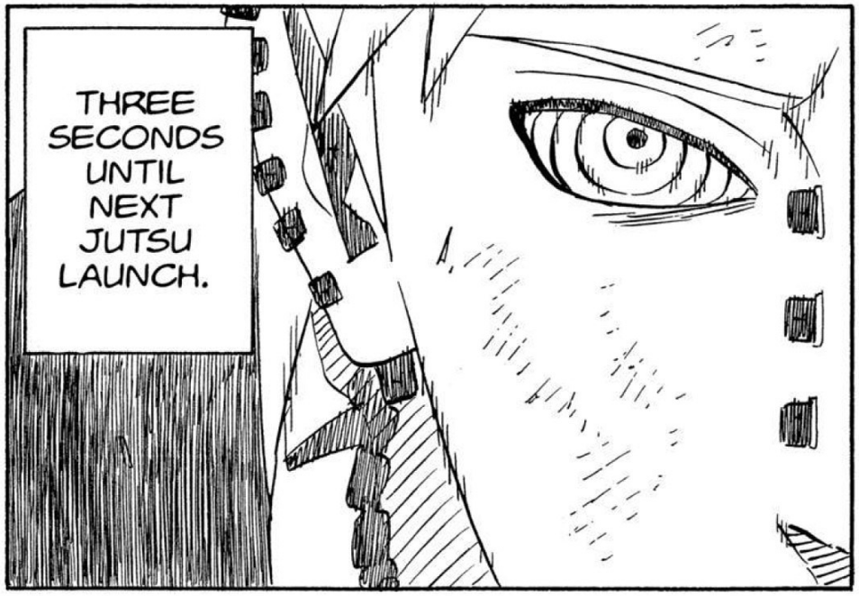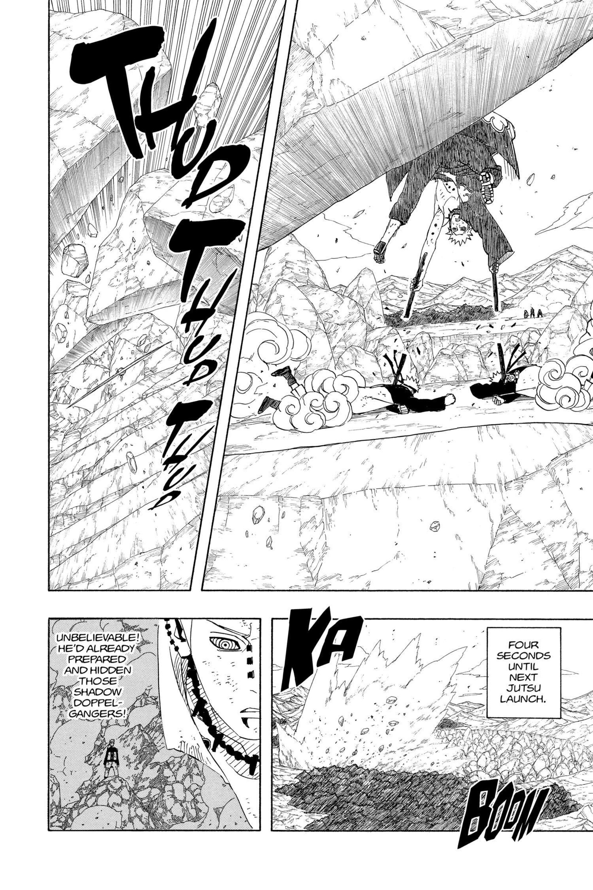 >>286690681>>286690661"............" is implying he's deep in thought. The next two panels focus heavily on the smoke and Naruto standing in it alongside the falling rocks and debris. This is further confirmed by this panel that is showing Naruto standing in the smoke, meaning Pain is explicitly telling the reader this is when Naruto made his clones.