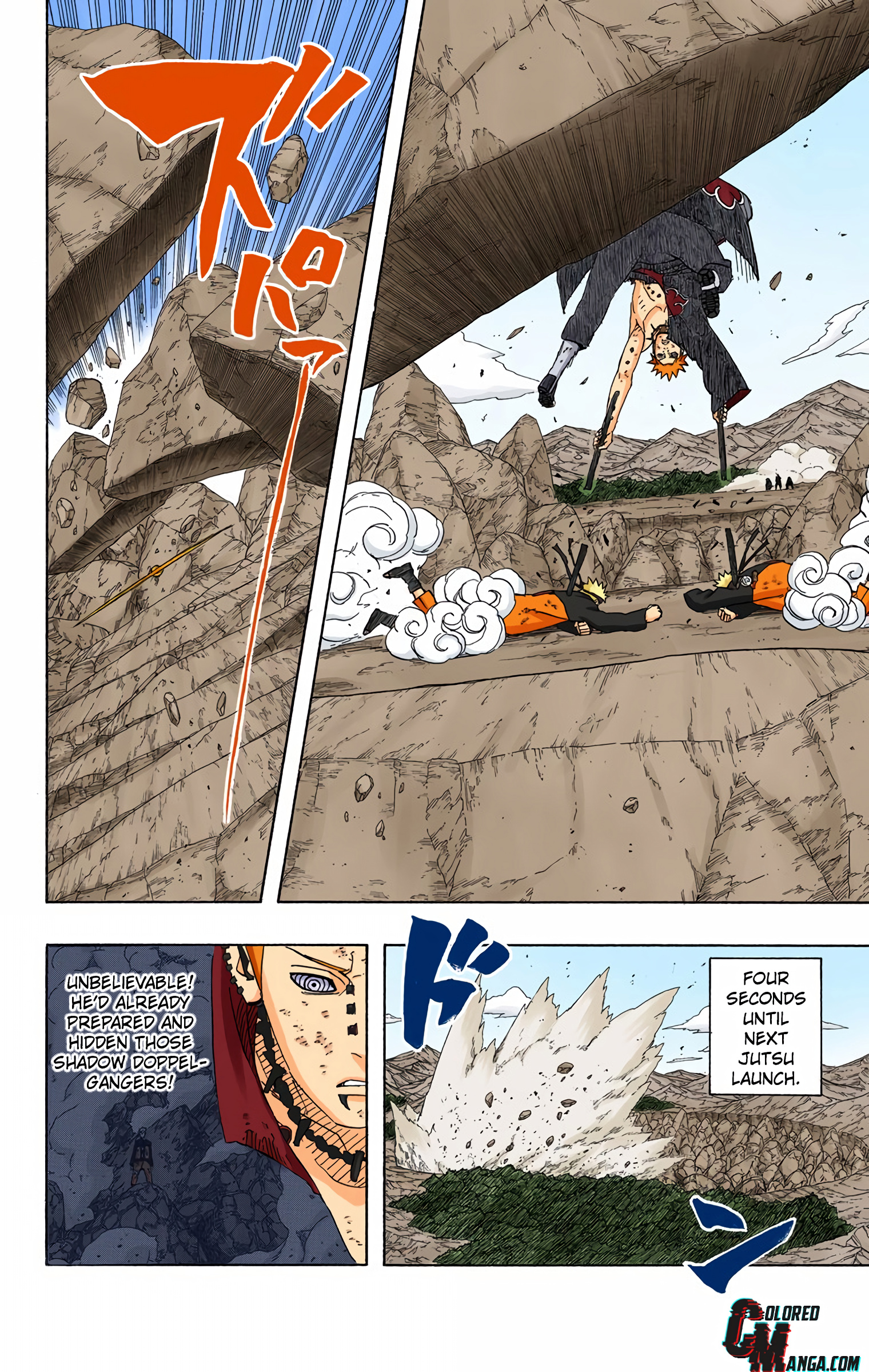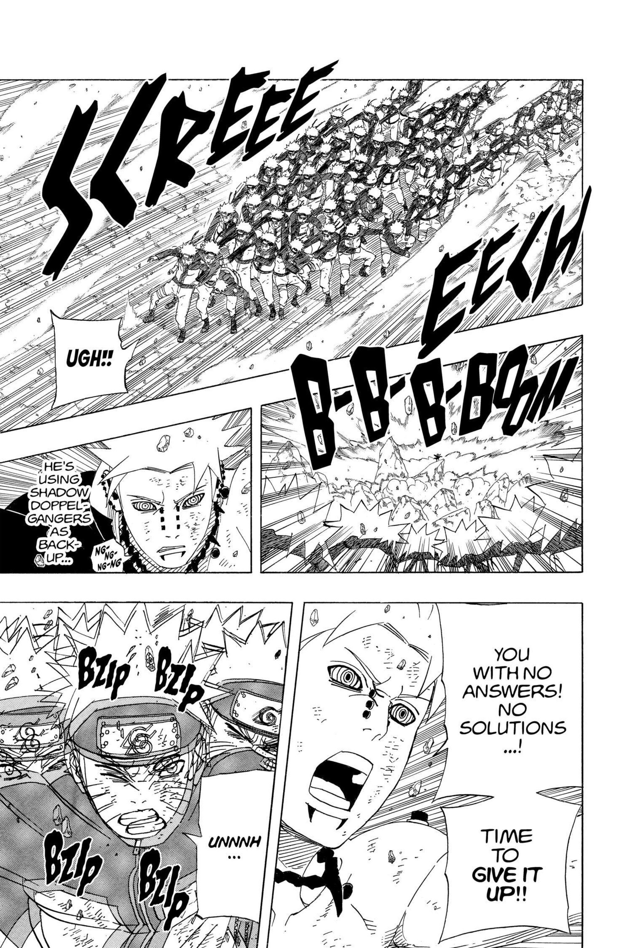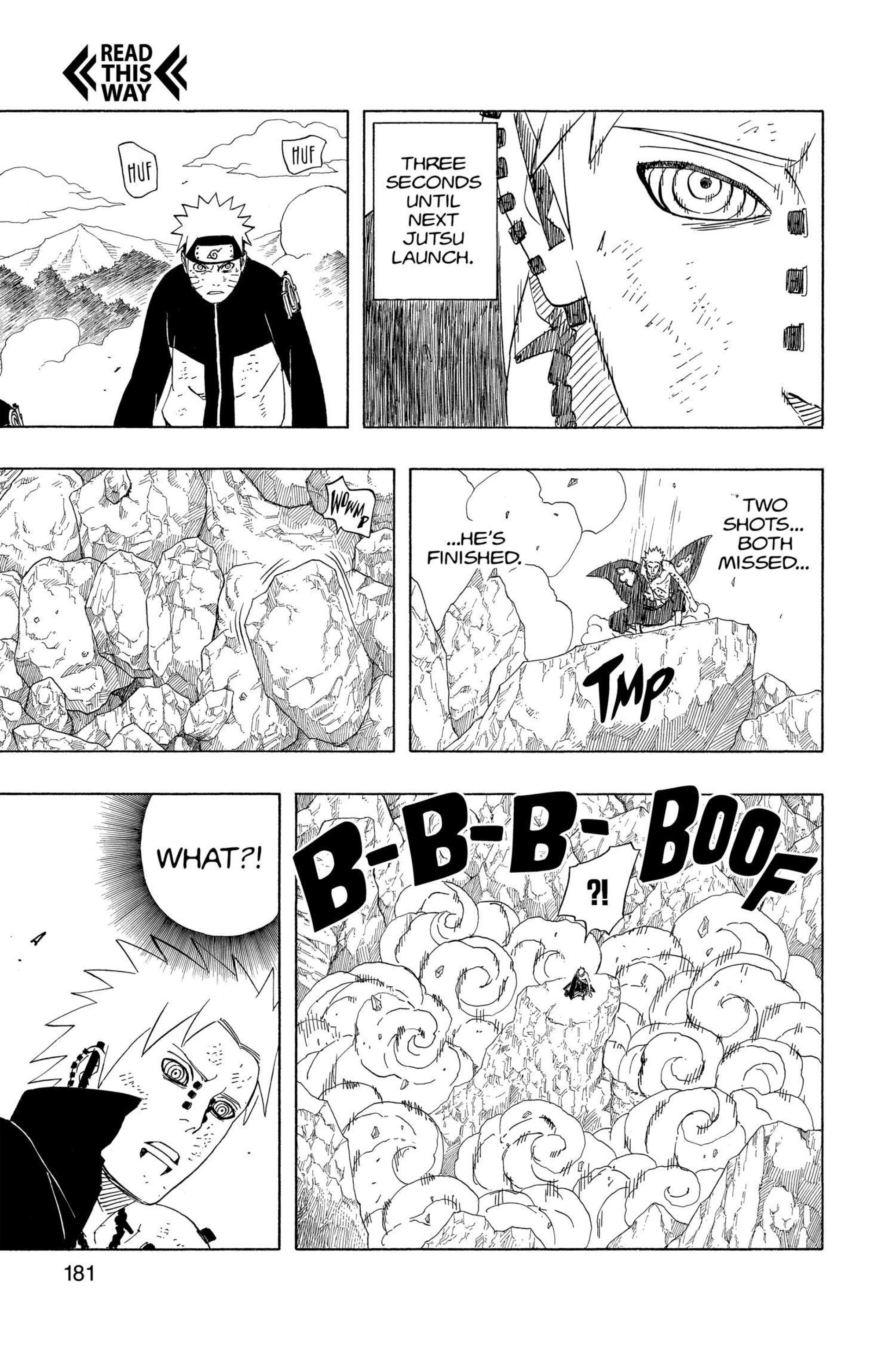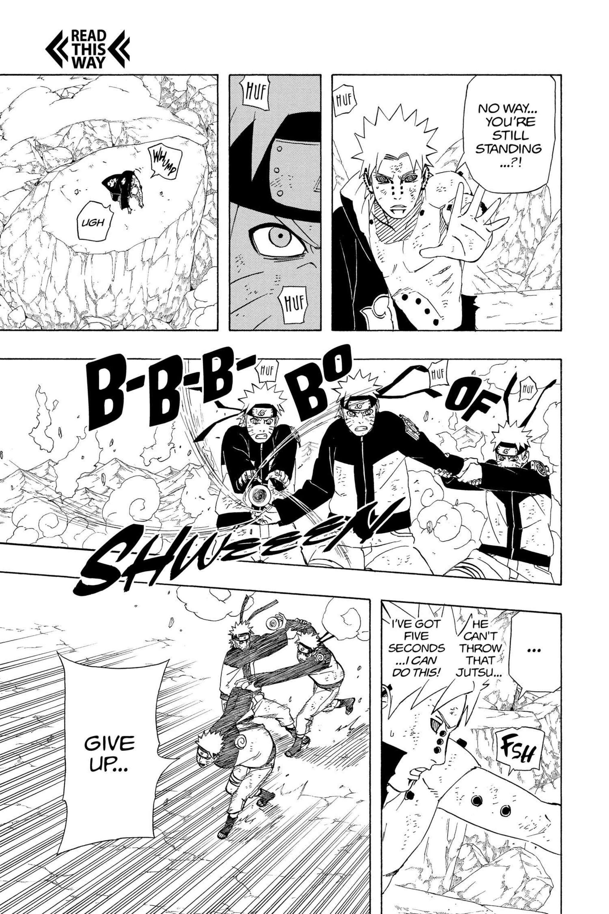 >>286690681>>286690661"............" is implying he's deep in thought. The next two panels focus heavily on the smoke and Naruto standing in it alongside the falling rocks and debris. This is further confirmed by this panel that is showing Naruto standing in the smoke, meaning Pain is explicitly telling the reader this is when Naruto made his clones.