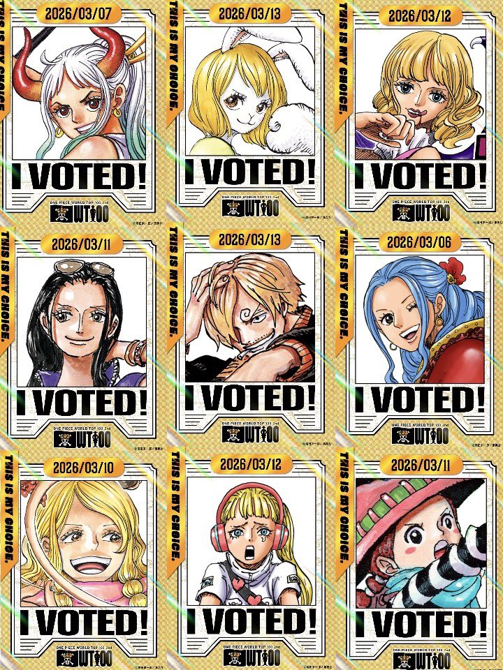 >>286700316Pudding..Zoro..Nami..Luffy..Chopper..Yamato..Robin..Carrot..Vivi..Jinbe..Usopp..Kiku..Franky..Momonosuke..