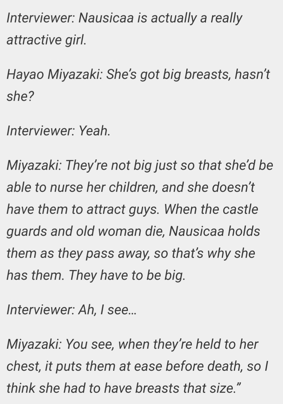 >>286695695Hayao Miyazaki>fucking otaku ruining Anime with their perversionsAlso Miyazaki>I gave this teenage girl fat titties for an important plot reason IT'S NOT PERVERTED OKAY?!?!
