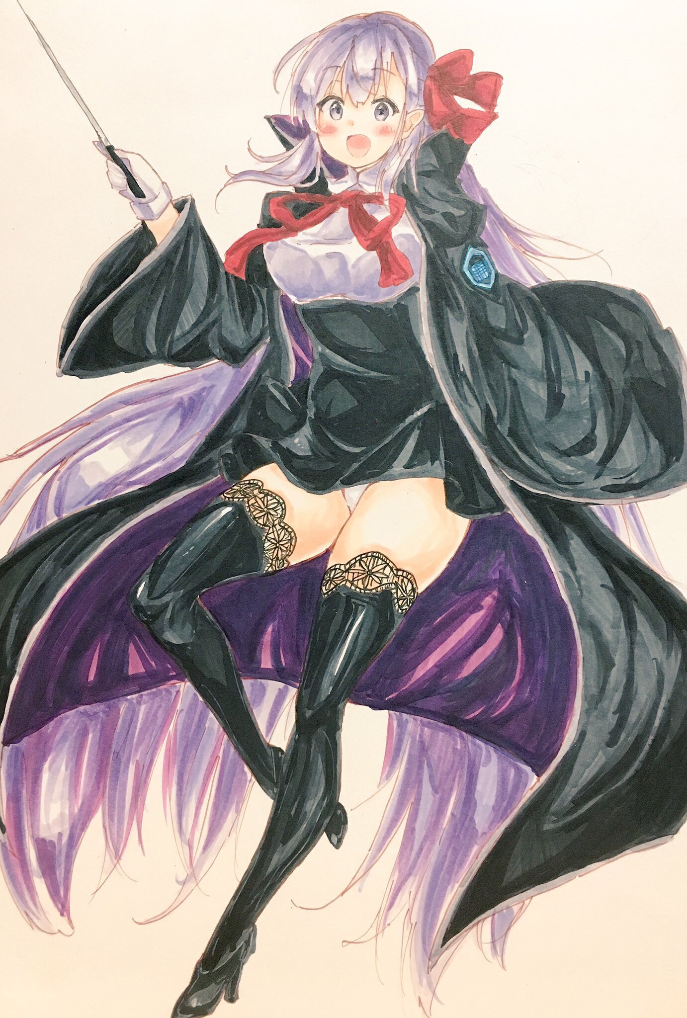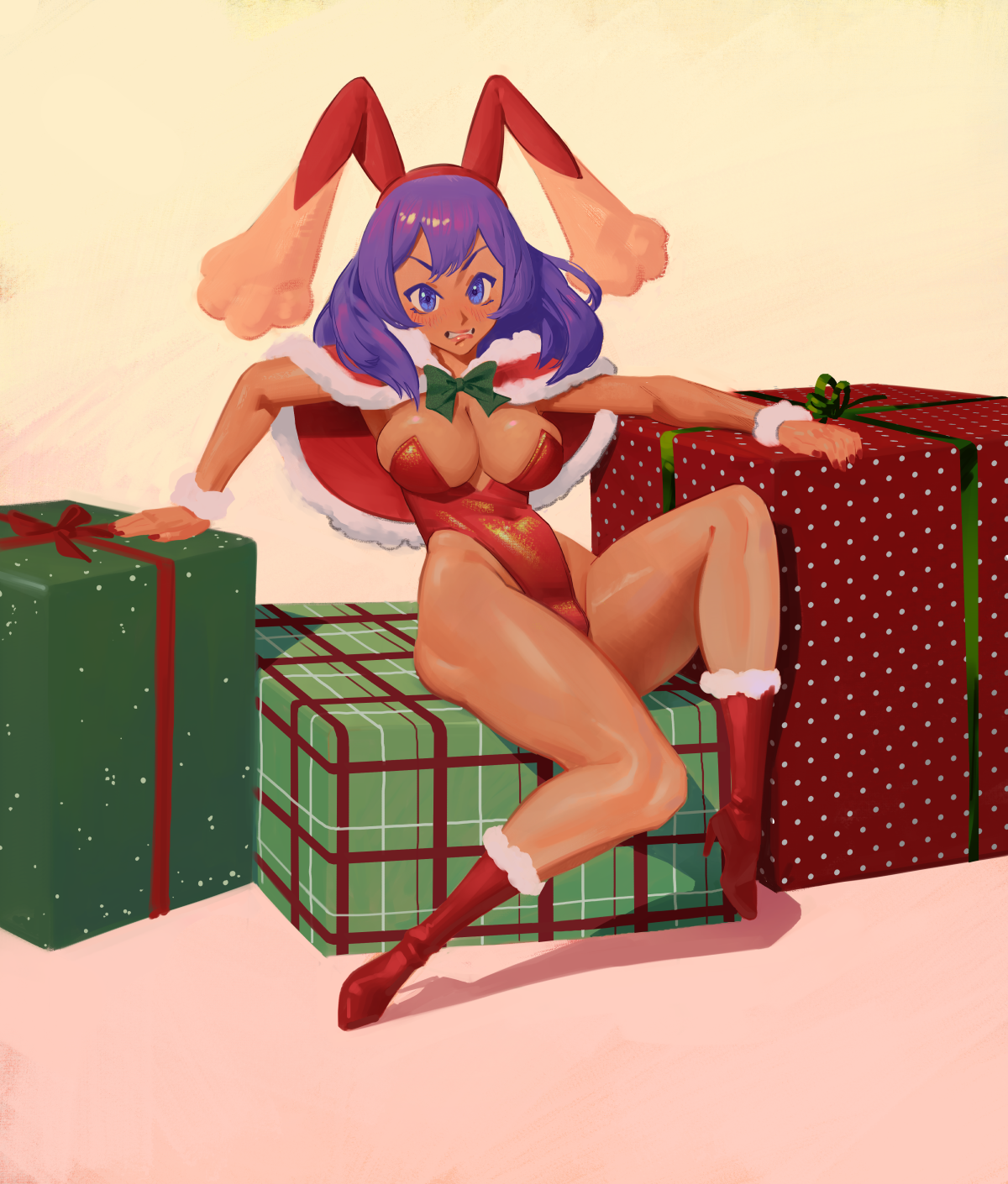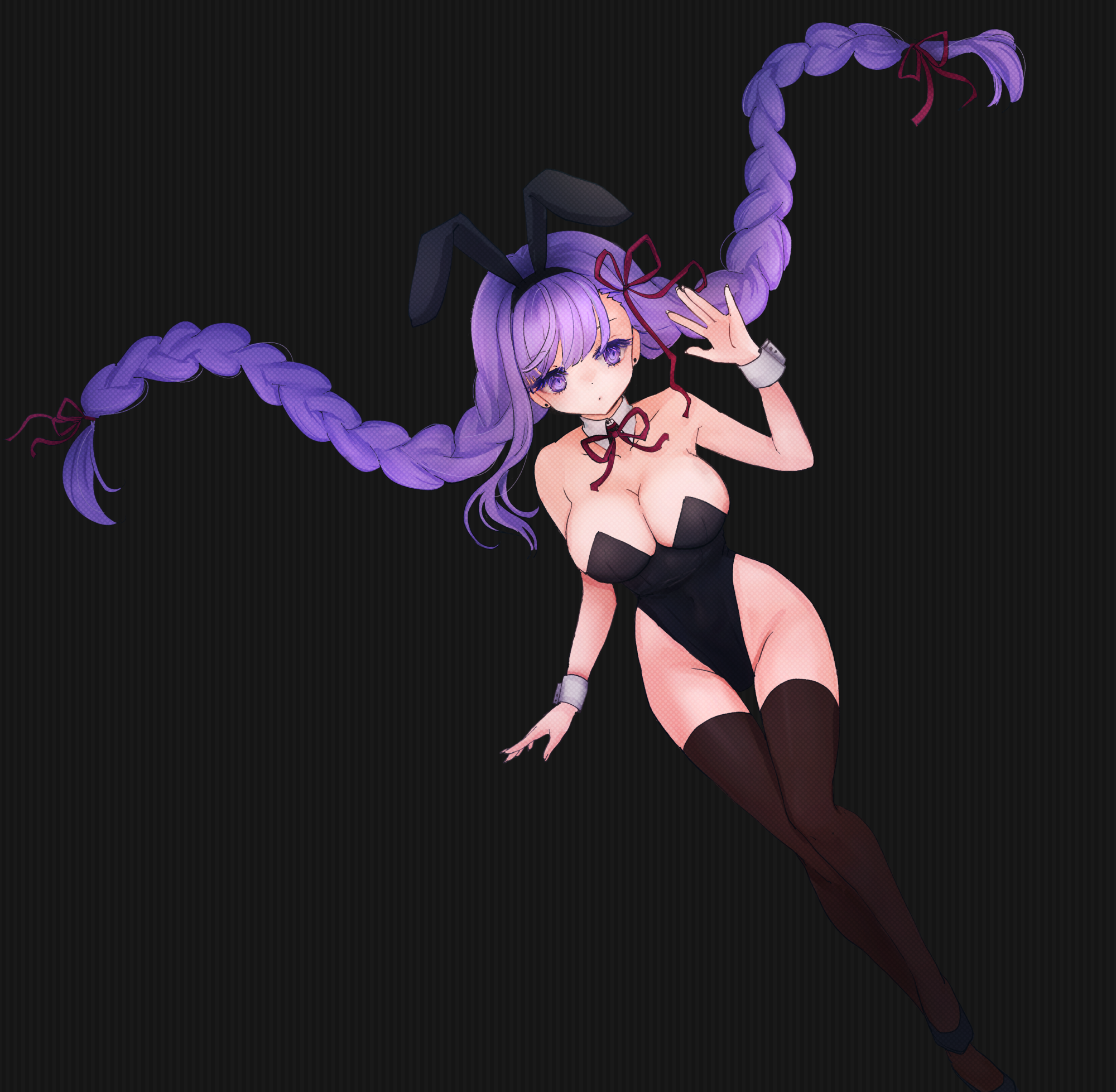 >>286707680Damn! Look at that. I love it! And it's two requests in one! She's right in my face and I wouldn't have it any other way. Thank you so very much Onilli. Where to even begin... I love the perspective. I've always loved angles that take height difference into account, so this is the perfect view to dote on and tease her from. It's also the perfect view to admire her great body, especially that bust. Smooth skin with a tight bodice. Very nice pose also, the posture feels very suited to her. And I love the cute way her butt sticks out a bit showing that adorable little bunny tail. Something about that part of the pose with her hand at the side(so pouty and cute I could totally see her stamping her foot in protest) strikes me as reminiscent of classic cartoons. Not sure why though. And again, the persepctive! The foreshortening on her arm and blur on her hand looks so good! Really skilled work. I've always wanted to see her do that gesture, so thank you, especially while angry or pouty. I can easily imagine her calling me a perv for wanting her to wear an outfit like that, heh. Glad to see Dolce added her own touch with the collar. Always delighted to have elements of her normal dress appear in different outfits. I really can't get enough of the rendering all around, and man, the texture of the fishnet on those glorious legs... Cool heels. I'm enjoying the detail on her hands as well. God I love the way you did her hair. Big, lovely tails, gorgeous color and texture. And sharp bangs just how I like 'em! Monochrome images with a pop of color is so underrated, I even have a commission based on the idea. So so good! I absolutely dig the realistic take on Dolce's face. All the subtle shading giving structure to her face. Insane detail on her mouth too. Cute nose. I just want to bump my own nose against it when I kiss her! And such enchantingly beautiful eyes, as angry as they are. Cute furrowed brows. Naturally, I'll never not mention her pretty pointy ears.