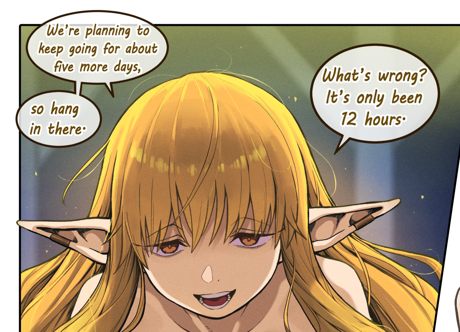 >*cough**cough* By the goddess, that merchant we met a while ago wasn't kidding when he said his strain was strongHey Fern, listen to this. Can't we,like, give some herb to the demons? They are really violent and shit. I bet that if they had some they'd relax and realize we are all brothers and sisters and we'd just chill together in peace and love. Fern ... why are you looking at me like this and what are you doing with your staff?