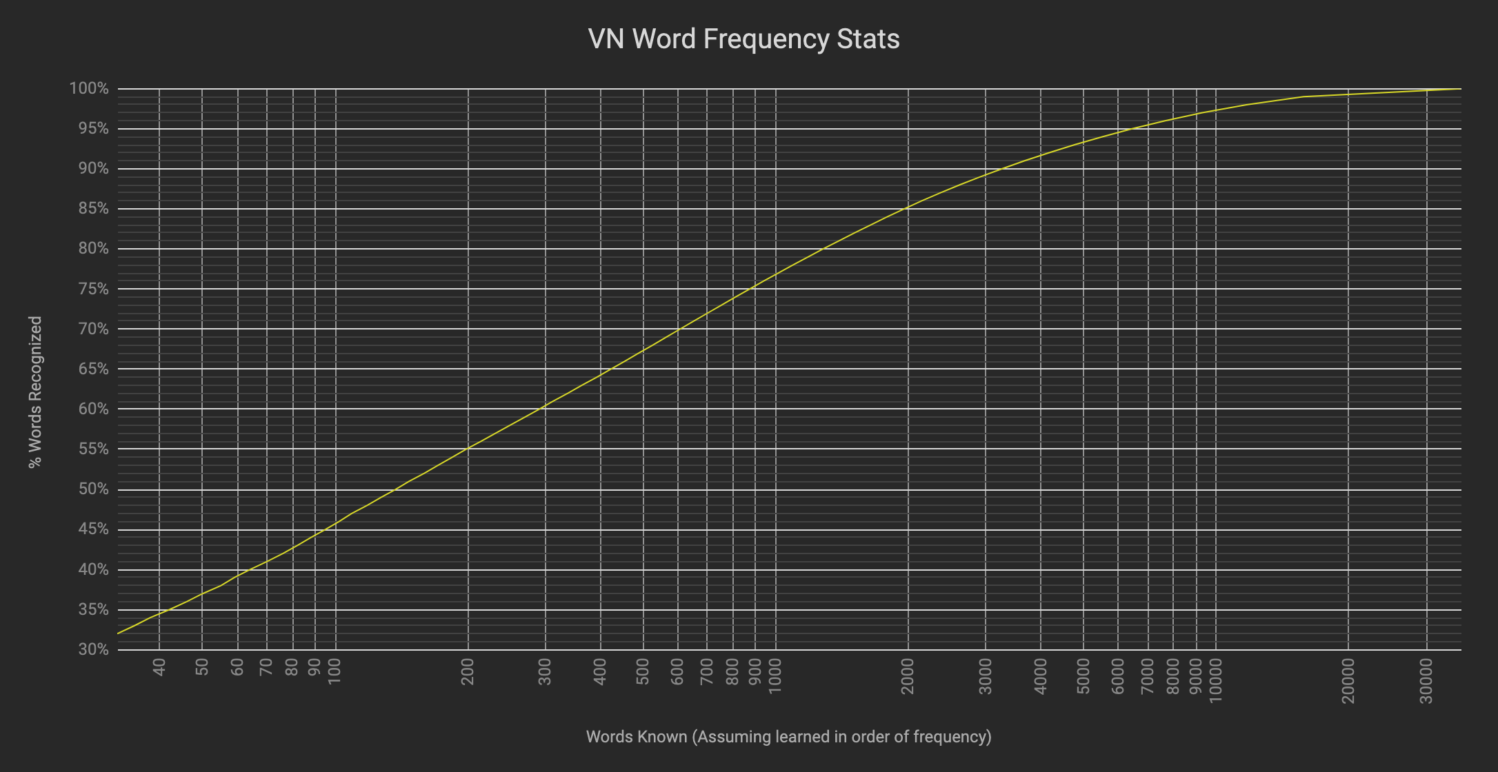 >>286720709See pic related. If you learn only 1000 words, you'll know over 75% of words used in visual novels. Anime and manga vocabulary is even simpler. The rest you can figure out with a dictionary.Get comfortable with that dictionary though, you'll need it for the other 29000 words.