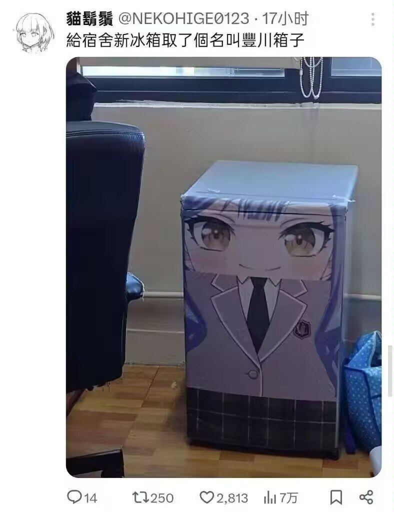 >>286723705>I have the fridge in the dorm the name of "Togawa Chestiko". It's a pun. The word 祥 (xiáng) is nearly homophonous with the word 箱 (xiāng), meaning box, or more specifically, 箱子 meaning suitcase/chest or 冰箱 meaning refrigerator (literally "ice chest").