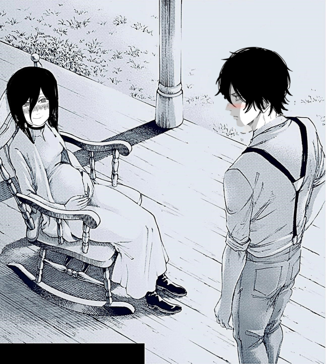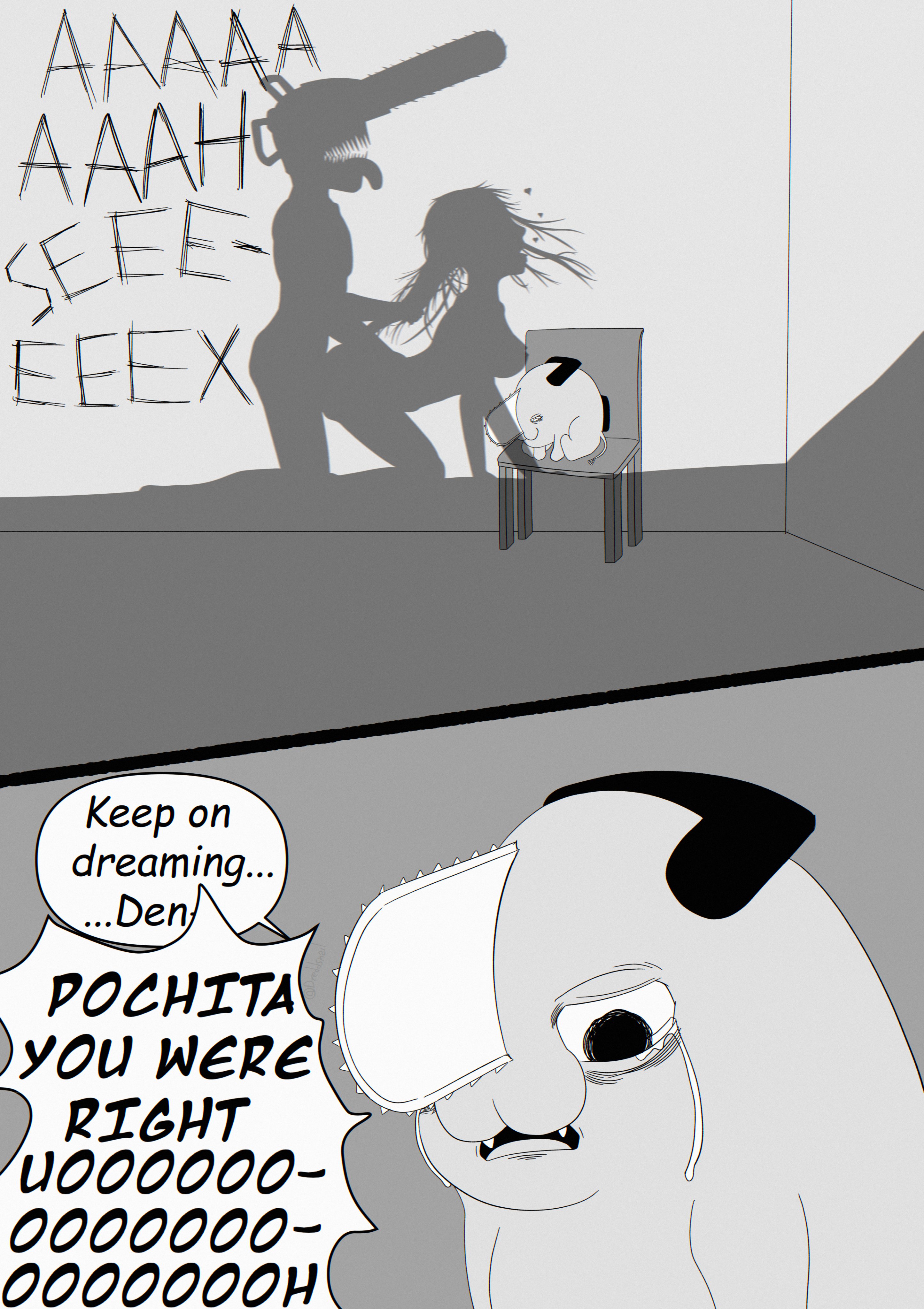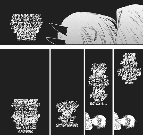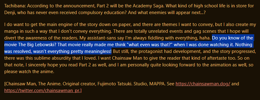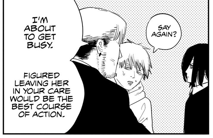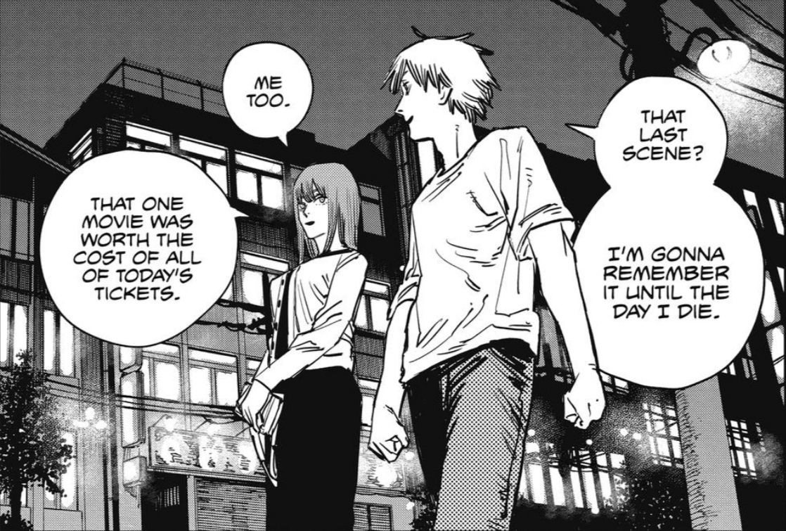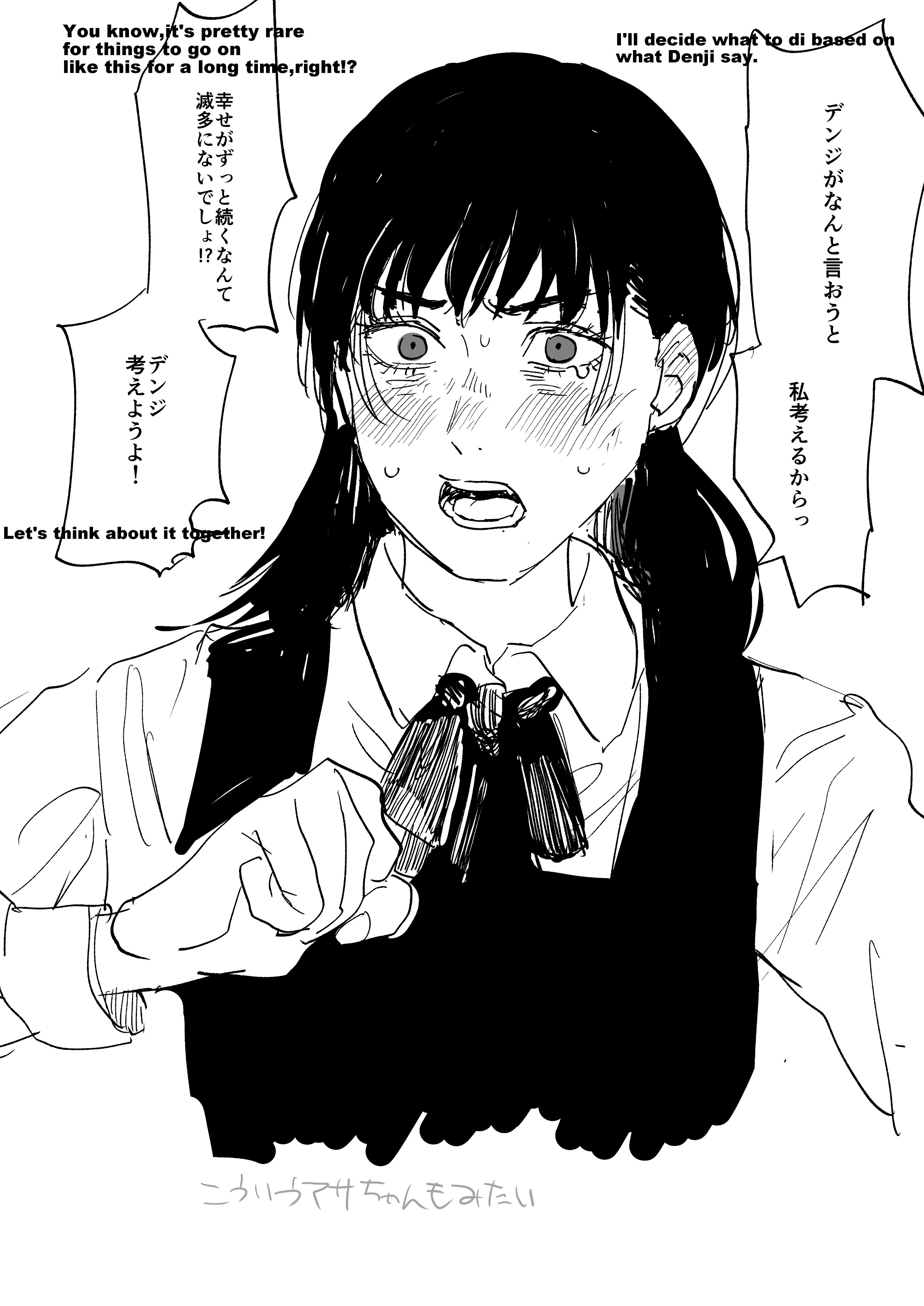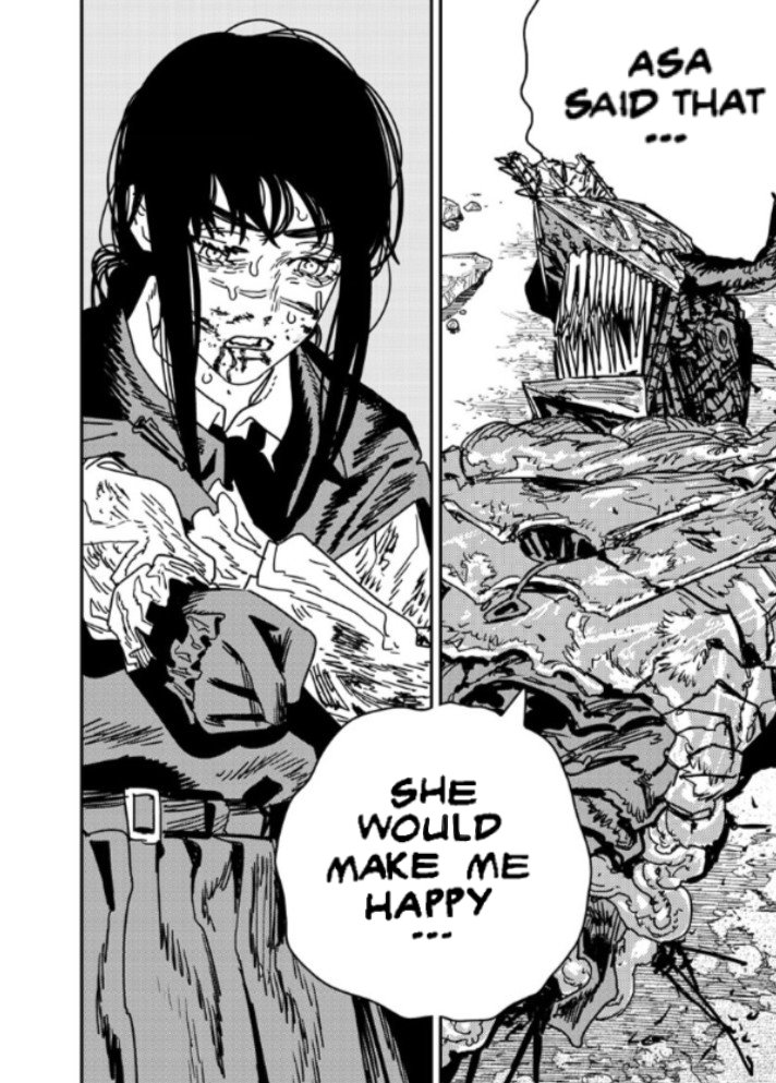 >>286731662>Last chapter has Denji simply living through the motions because he did everything and remembers everything, but feels void as if something's lacking inside him. He has a dog w/ him.>Suddenly someone knocks the door>Finally found you, Denji.>He just turns around and doesn't answer and gives the visitor his back. He simply thought it was that thing he was expecting that could fill his void.>Is this what you want?>he mumbles something inaudible for us, but she hears perfectly.>And do you really feel satisfied??>No answer>He just slightly shakes his head after some minutes, not facing her.>She grits her teeth wanting to smack him or kick him in his balls, but chooses to sit down.>It's just as i expected, you are such an idiot and because of that, you can't think properly. But i can understand why the insatisfaction. I also feel insatisfied with things (keeps cuddling Denji's dog, who seems to have taken a liking for that person).>Let's think a way together>Denji turns his head after not facing her. He finds out she also brought a book with an illustration that brings him some deja vu he feels like remembering, but doesn't know the resson why: the book says "Chainsaw Man vs War devil: a story documented by Fumiko Mifune">After all... we are people with unreachable dreams.