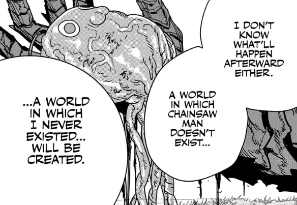 I got it. A world without Chainsaw Man is just our world, meaning one with no devils, no powers, no magic, no bs etc. And in that world Asa will be a mangaka and she'll write a manga named Axe Man which is the whole CSM series we read...you rike?