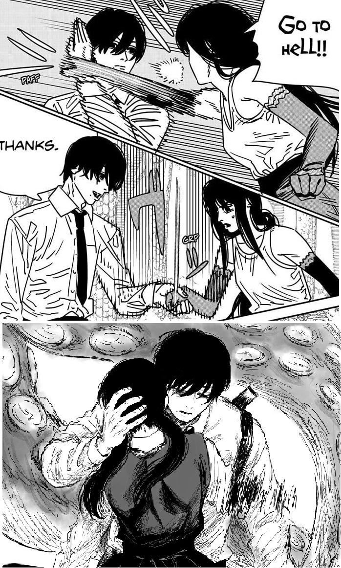 Also, I don't know if anyone has talked about this, but Pochita claiming he's seen all the dreams he wanted to see so he's fine with erasing himself reminds me of Denji's defeatism in the dumpster, after Power hugs him and tells him she's come to save him.Pic related.>So I'm good...there's nothing good waiting for me in life anymore anyway.