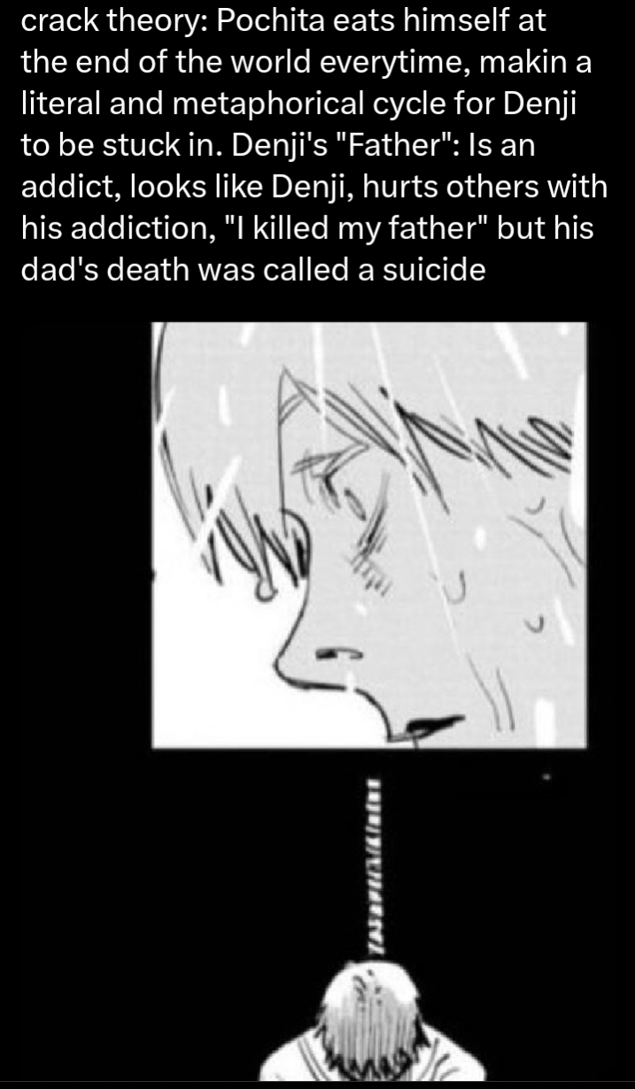 >>286722881>The only way Pochita eating himself would cause any kind of important change is if Pochita was the Devil Devil and by eating himself all the Devils disappeared.If that's true we should return in time to when devils showed up on Earth and go from there to see how history changed on world scale than land in hobo Denji shack.I bet eating Pochita just means everyone forgot about CSM and all devils he ate became free.So Death is alive, same with Nazi and Nuke now, Denji is alive with sick heart who doesn't remember anything cuas ehis memory was erased from moment Pochita made a contract with him.But other characters remember him as Denji cause only CSM part was eaten.