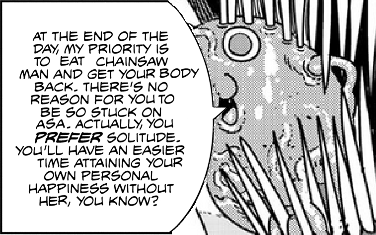 Intentions matter I guess, I could believe Denji legitimately cares about Asa, but the fact is Yoru will continue to suffocate Asa's existence, and Denji took a terrible part in that. As harshly as Pochita put it, I think Denji needed to hear that from someone close to him, not just a random person. I'm interested in the next time Denji meets Yoru in the final chapter.