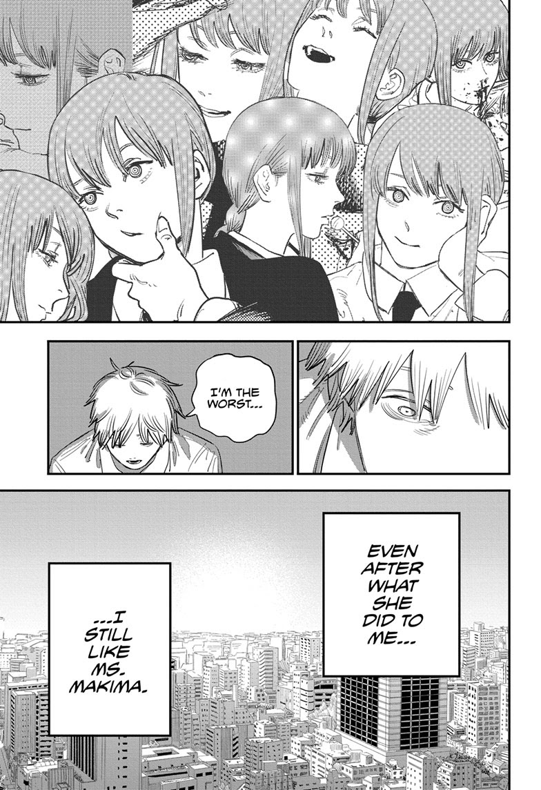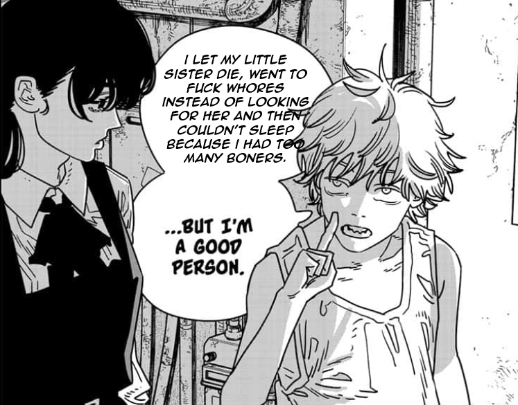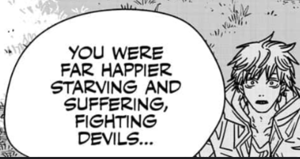Not defending the direction, but there’s really nothing wrong from a writing standpoint about Denji preferring to be CSM and always chasing pleasure over normal happiness. People are weirdly annoyed over him not changing yet one of the reasons people liked him in the first place was because he’s a selfish anti hero and not a goody two shoes. It’s funny because people liked when Eren and Phos became kids unhinged and there characters were praised for it