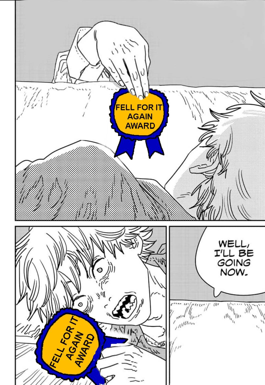 Now they cope by saying Reze would have fixed Denji and everyone would live happily ever after. I don't get where they get this perfect Reze who can fix people from. The Reze I read had flaws, was immature, and wanted the complete opposite of what Denji wanted. We have no reason to think he wouldn't do the exact same thing he's done in every situation in the manga until then and since then.