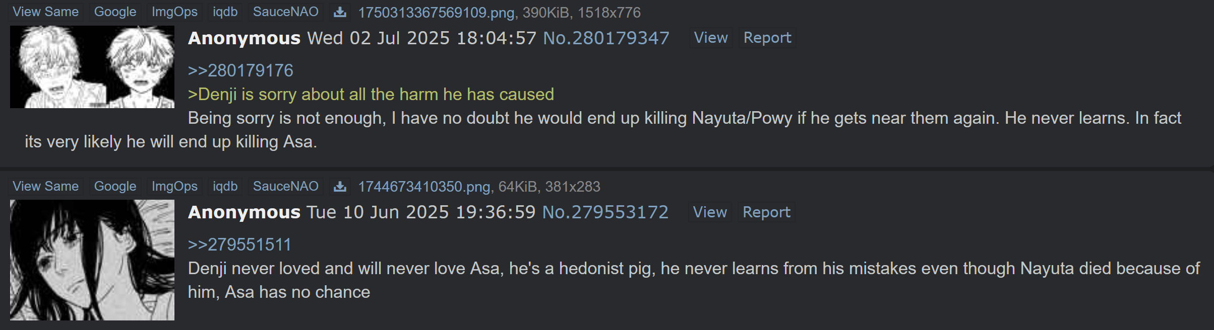 A big part of it is that he probably thought Asa's relationship with Yoru can be improved like he was able to get along with Power, and Nayuta, but he hadn't seen the shit Yoru put Asa through. Hurting her when she's suicidal, demanding she kills her friend, mocking her when said friend was being manipulated by a Devil, the constant death threats, doesn't even know Asa was trying to save him from being turned into a weapon. Still, none of this is to defend Denji, he saw Asa being suicidal as well and his solution was as poorly thought as you'd expect. His own cope, just do fun things and deal with bad situations when they happen, consequences be damned. I don't think Denji is malicious in trying to save Yoru, he can identify with both Devils and humans, to him his affection for Yoru is just as real as for Asa, in the end, he can't see past his own needs, that is, wanting sex. When in reality either Asa or Yoru would have happily been his girlfriend, had he not decided to let Asa get more abused. Alas, Asa's suffering wasn't important to him.