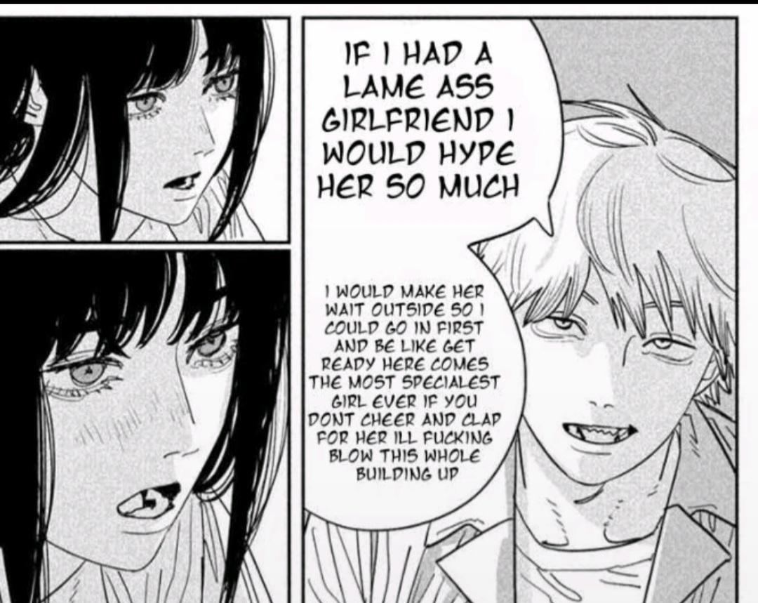 I personally have nothing against Reze, she's a cool character and all that. But I simply cannot buy this whole "Reze would've fixed Denji" narrative. Pochita spells it out very clearly that he'd much rather live in a filthy shack chasing his next high like a drug addicted freak rather than spending time with someone who truly loves him.