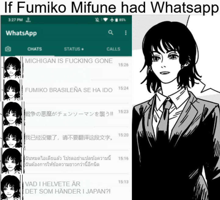 >>286738311In my fanfic she says >Y: why don't you want to go back to the real world? You wanted to live selfishly, don't give up on me now.>A: I thought I did, but what I really wanted was something else entirely.>Y: then let's do that, but you can't give up and die here.>A: you don't care about that, yoru.>Y: I don't, but you're still someone I could lose and I don't want that, just come, we'll try doing things your way>A: no>Y: why not?!>A: you got almost all the things you wanted, right? Beating chainsaw man, putting the whole world in terror of war. Even a boyfriend...>Y: what are you talking about?>A: one person, even if it was just one person, I wanted them to be glad I was born.>Y: Asa, I couldn't have made it without you, but you can't go.>A: not my call, Yoru, I got what, I managed to make one person happy, that person turned out to be you. Goodbye.>Y: asa no! I love you!!