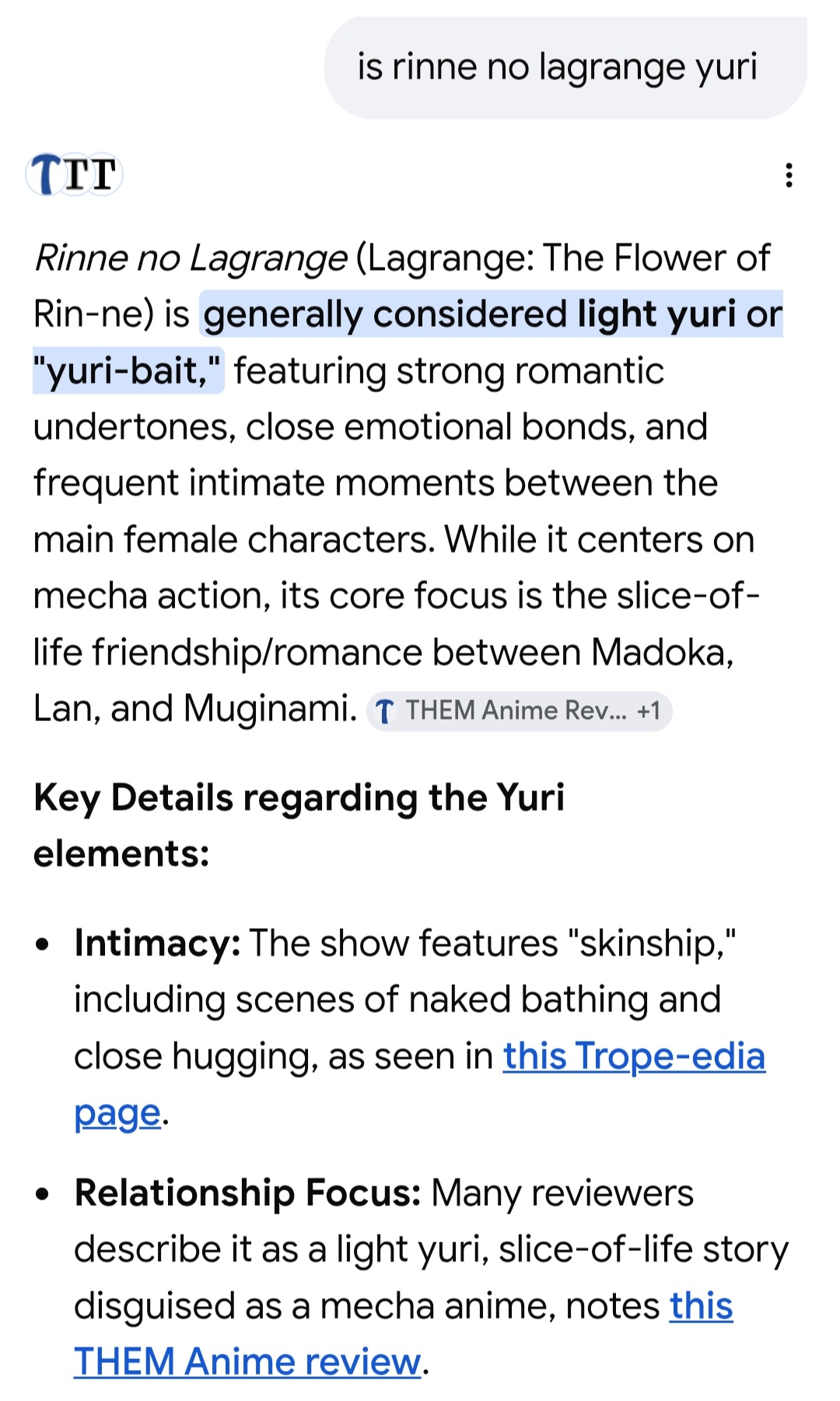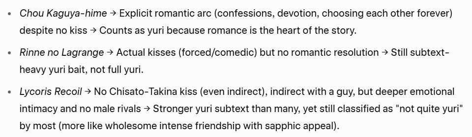>>286823209>/a/ yuri threads are containment threads relative to blue boardsNope, you can freely about yuri outside of these threads, just like you can with isekai or even stuff like mecha.