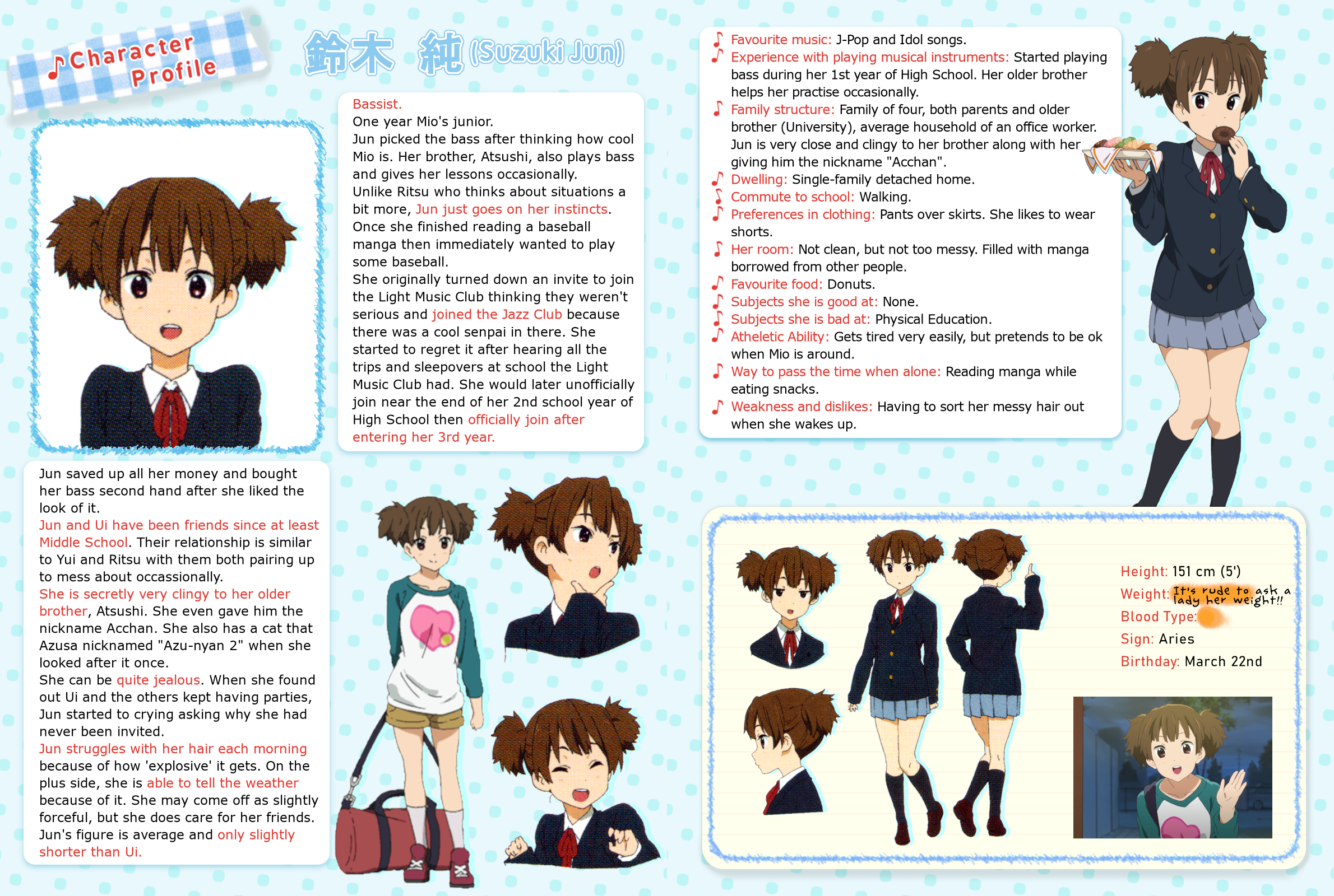 >>286918088The Manga Volume 4's Character list has Jun with her birth flower that is a RengeHer Character Song Midnight Superstar has her saying she's an Aries.Come With Me Live Script Reading has Ritsu refer to Jun as the youngest one thereWith the dates from the birth flower Renge that fit in the Aries range you get 22nd March, 8th, 13th & 18th AprilSince Japanese Schools start in April that means Jun would be born 22nd March for her to be the youngest of the lotAll we need is for KyoAni or TBS to release Jun's character profile (confirmed to exist) and we'd have proper confirmation of the date