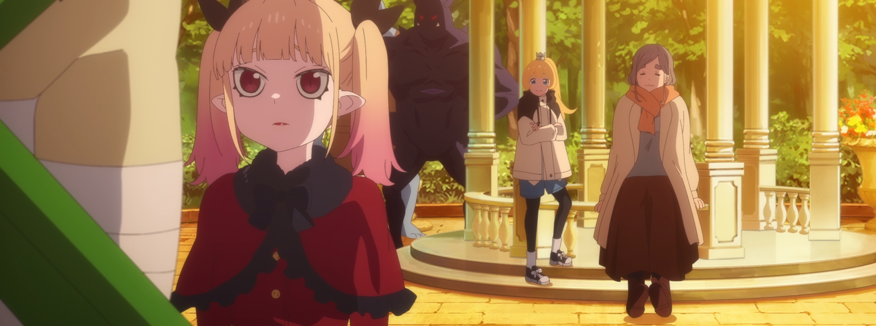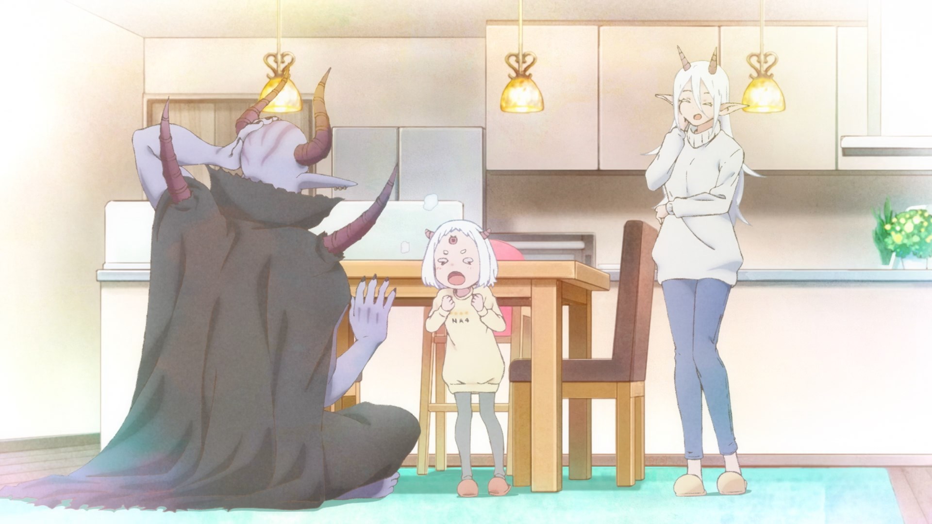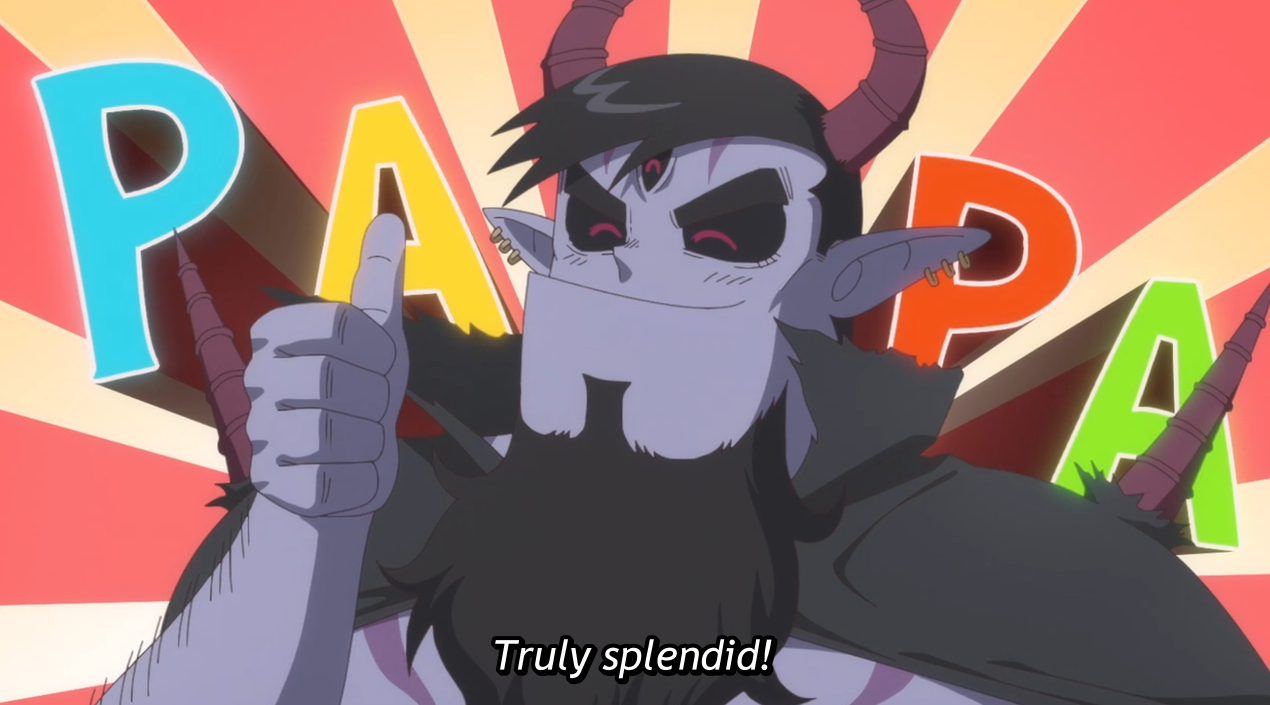 >When it comes to creating each episode of The Demon King's Daughter Is Too Kind!!, it's not the animation or the story that provides the biggest challenge. It's the music. Each episode of the anime contains an original children's song sung by Dou (and sometimes the other characters join in). “I've occasionally had insert songs in my anime up until now, but I don't think any other productions have done one [in every episode]. So, we took on the challenge of doing it—and it was actually my idea—but when we actually started doing it, I realized how much of a hassle it was.”