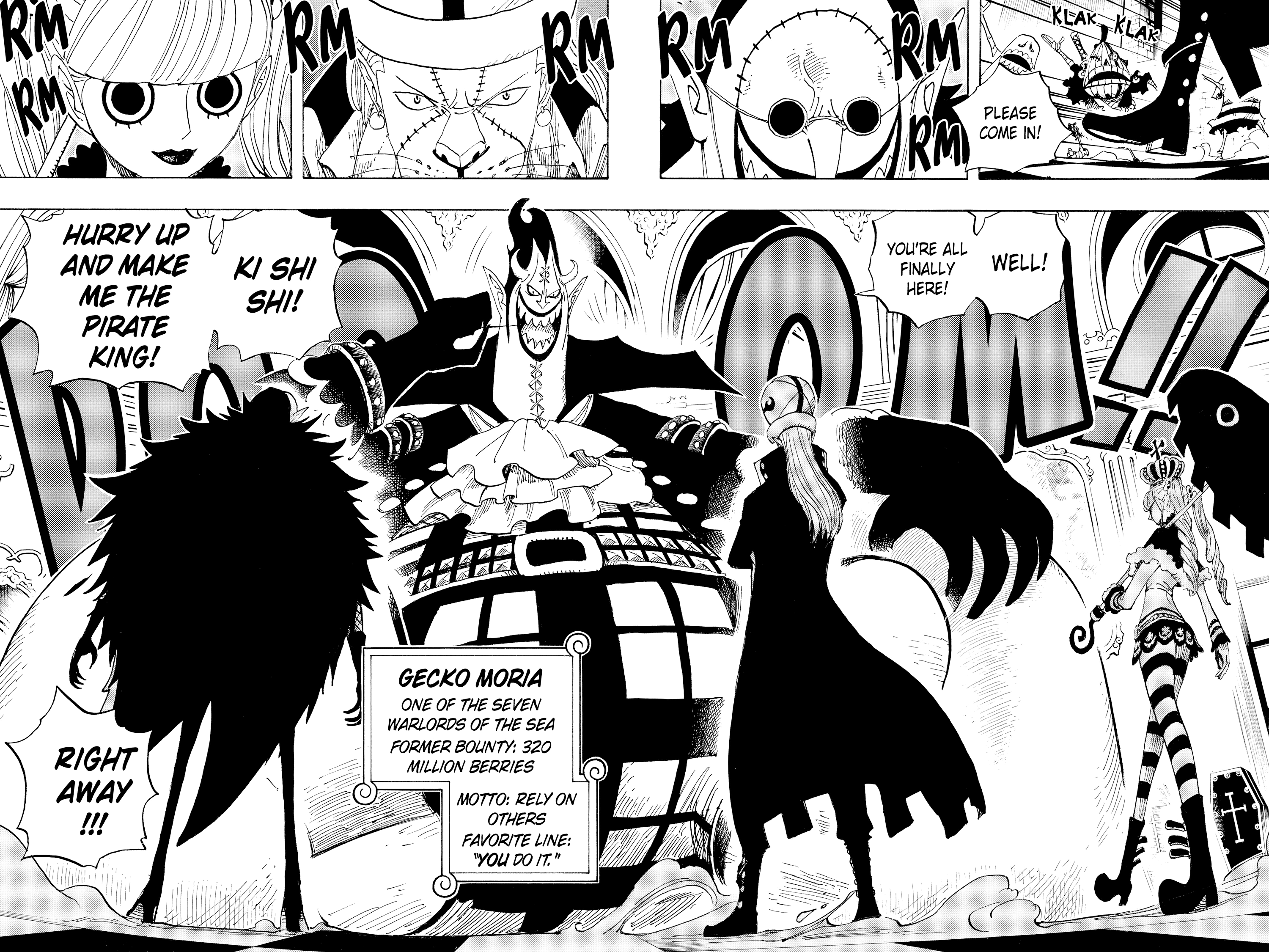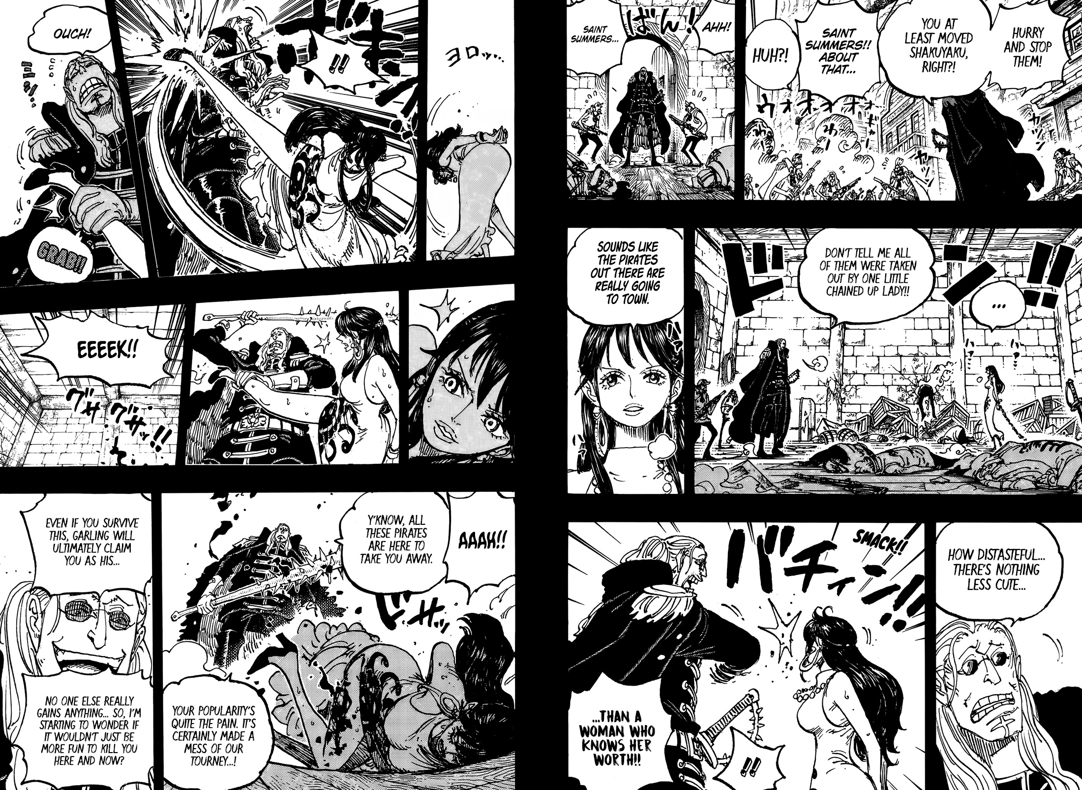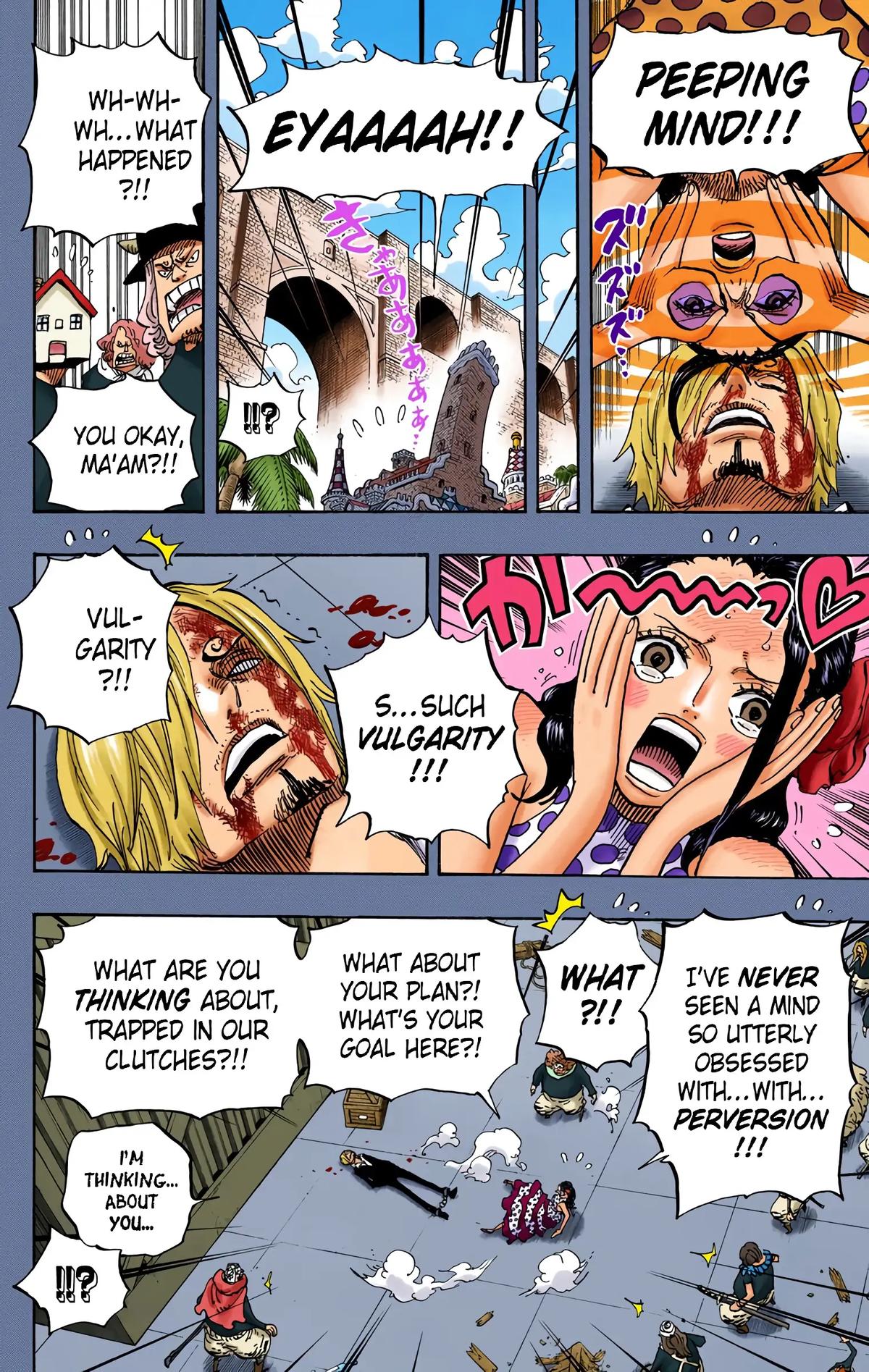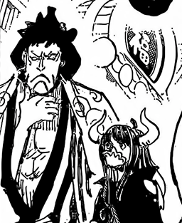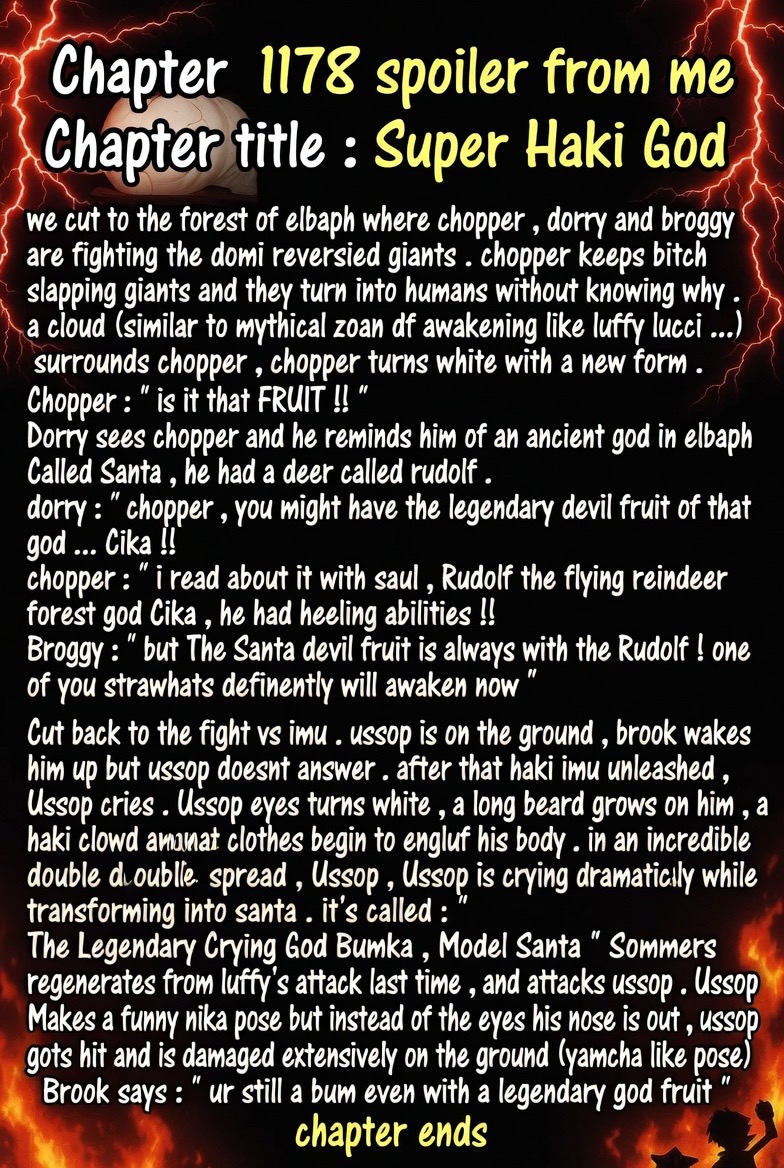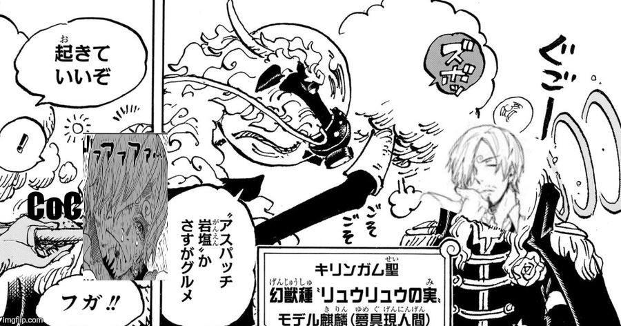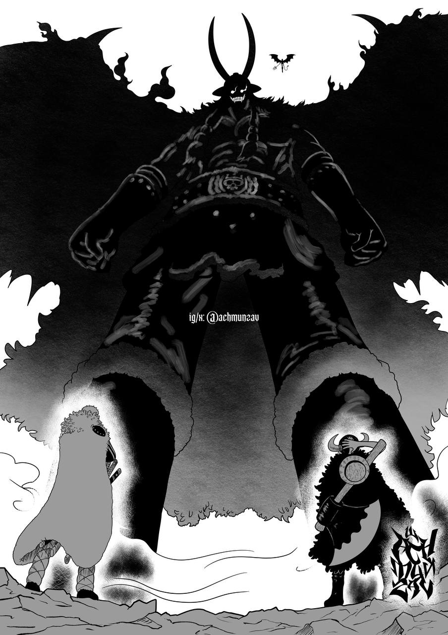 - Imu summons a book and speaks in an ancient language. Killingham and Sommer's notice Imu's voice in their heads and get a headache- the unknown language is from the first world. Killingham and Sommers explode and turn into black flames. Sanji and the rest are shocked.- The flames rearrange and create new bodies for Killingham and Sommers. Both are completely black and covered in flames.They look like actual demons and still have their personalities- Imu then summons new demons from his book. One is a giant cyclops, one a harpy and the third one is devil skeleton with a huge blade.- The devil attacks Zoro, the harpy flies towards Nami and the cyclops attacks the giants- Luffy & Loki clash with Imu and split the sky and the earth- countless demons emerge from the split earth and create a hellish scenery.- Imu: "hell is the divine punishment for those who disobey Mu."