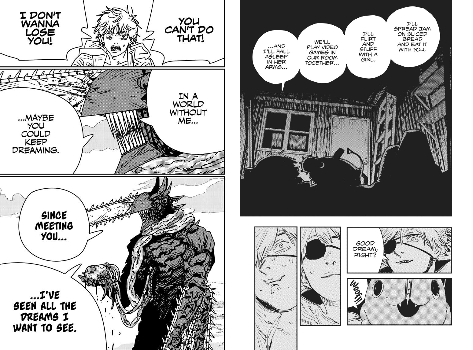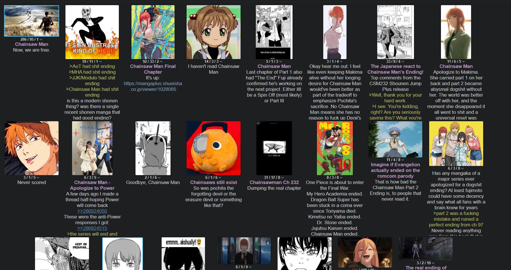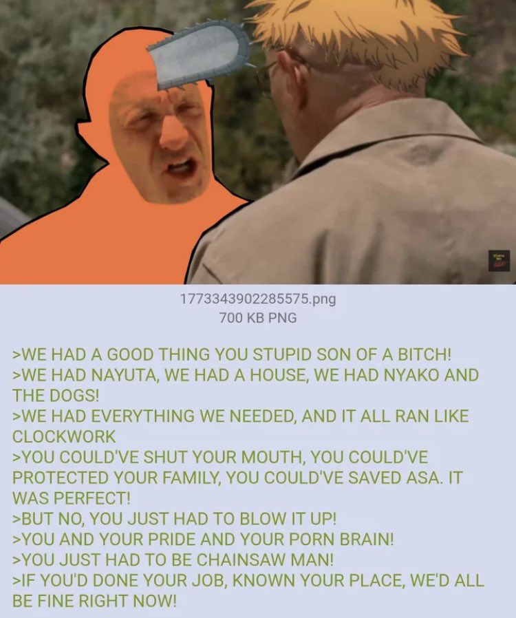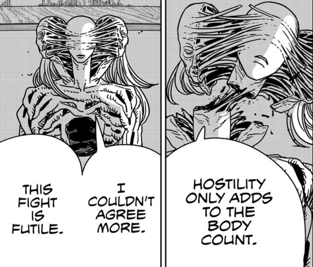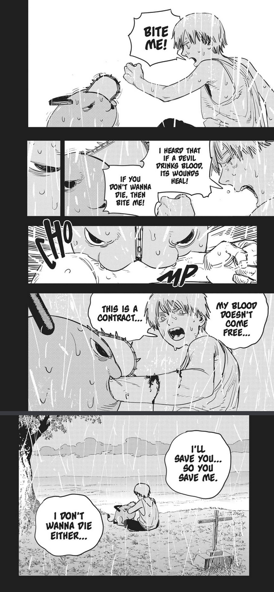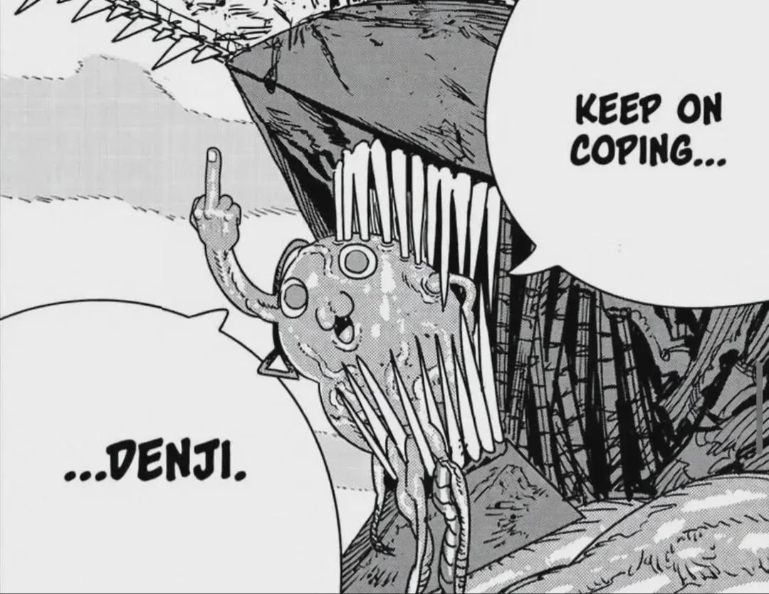 >>286967247So instead of Fujimoto writing a way to get Denji back he just fucking gives up entirely by killing everything the series stood for? Fujimoto got himself in this narrative hole, nobody else's fault but his, and when he realized he couldn't dig himself out he took the easy way out and said "fuck it nothing matters". Hack.>>286967253This whole page was actually Fujimoto saying "hey one day for no reason Pochita will just eat himself when he's okay with not existing anymore and invalidate all the struggles they went through together because it will save Denji like Denji saved him"