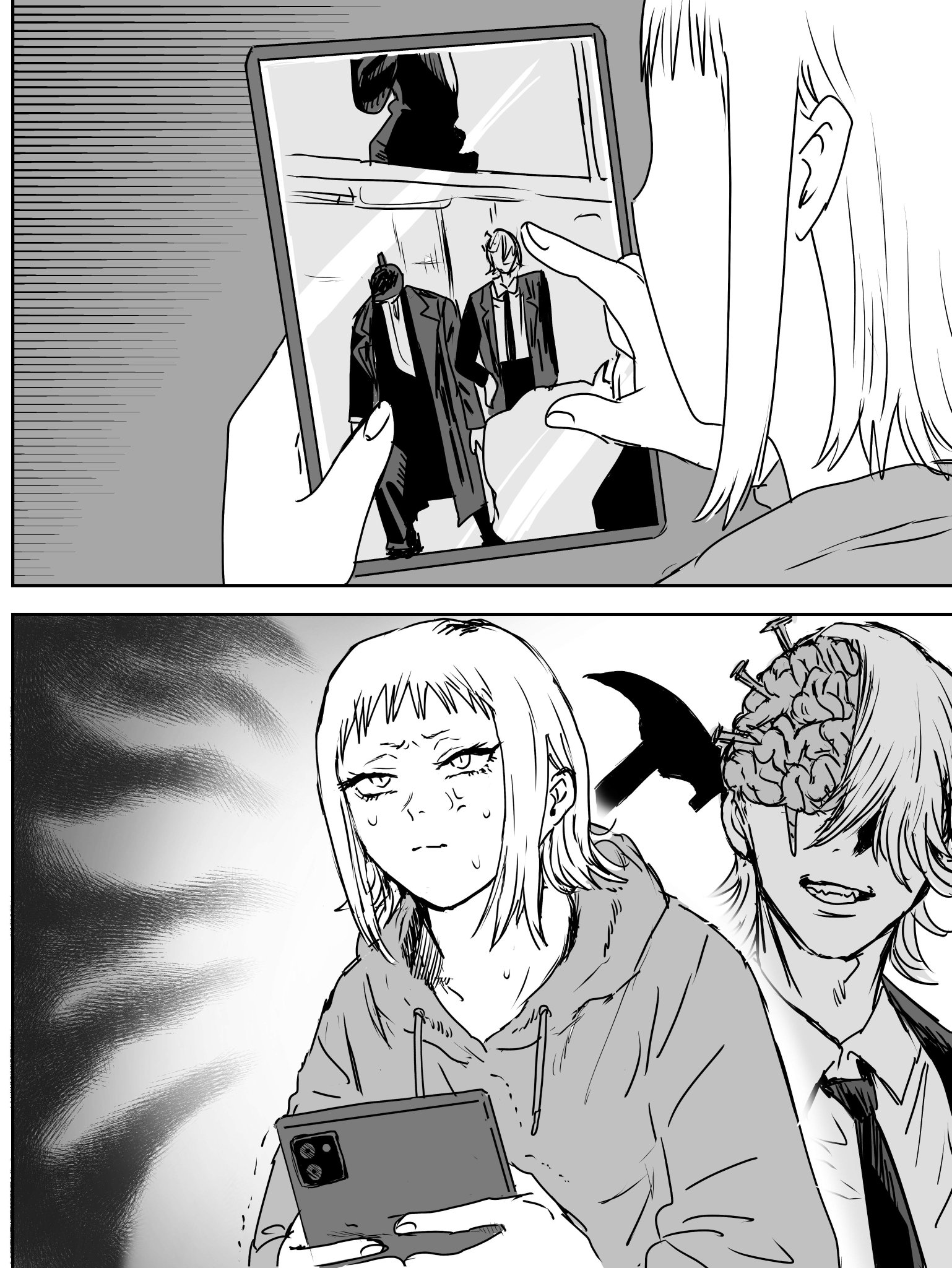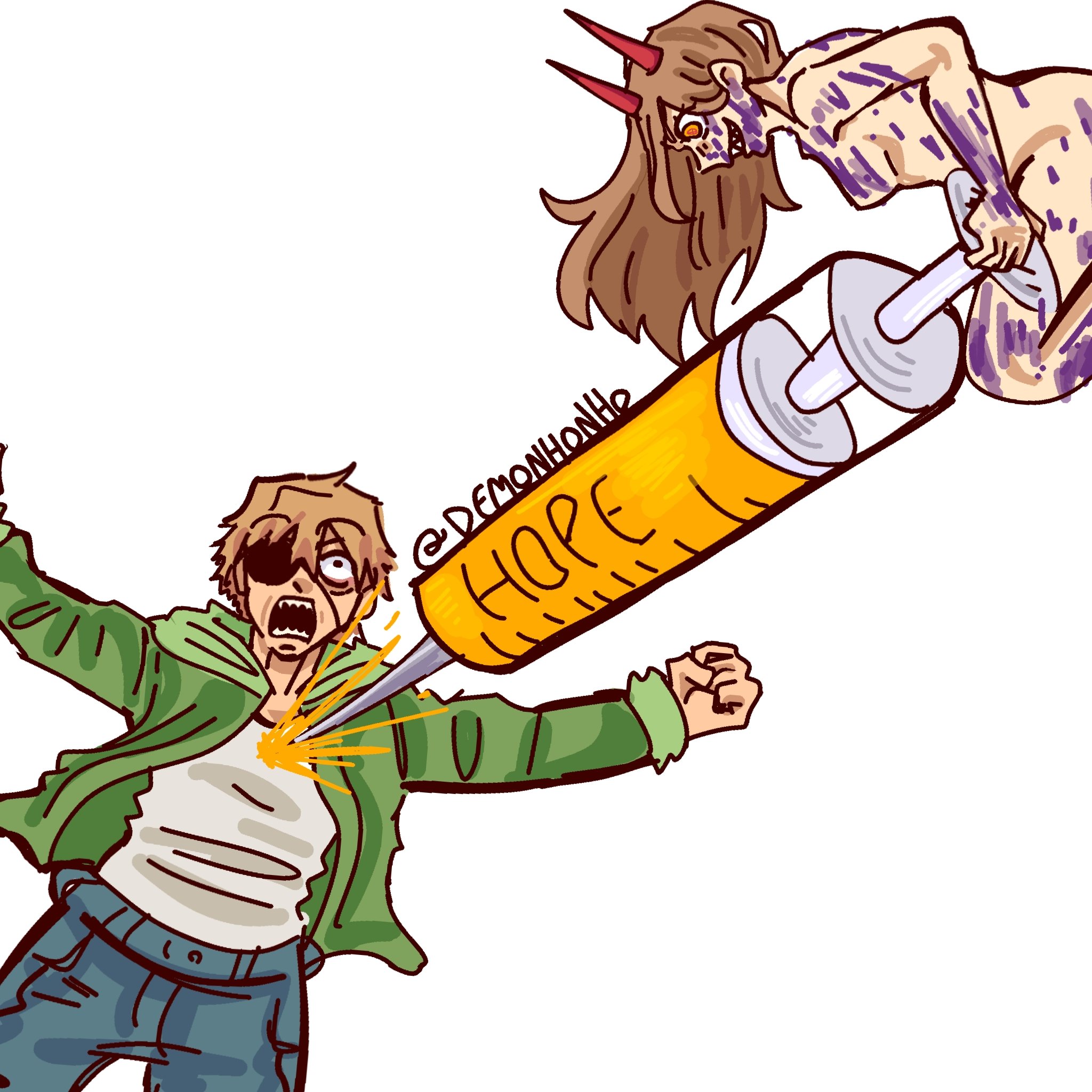 >Thank you, Chainsaw Man>Wh-what did you just say?>Um…thanks, Chainsaw Man? Y’know, because you had a chainsaw…before you stopped me from falling over*Denji turns to Power*>Alright Power, I think I figured out a cool superhero name…how about*TITLE SCREEN*