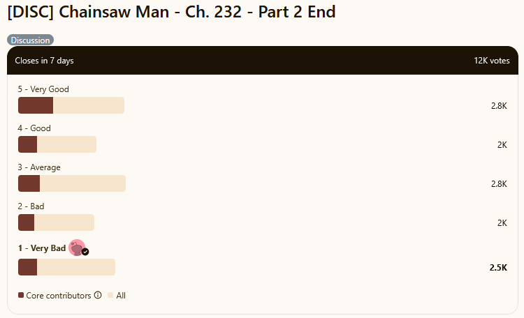 >>286958376It was a bad, nonsensical, and abrupt ending, but I must admit it was kinda sweet how he ended living back with Power.Thinking about it, and specially the stuff that Pochita said last chapter, this really is Denji's ideal environment. Just living paycheck to paycheck but without the crippling debt, being with one family member in Power for company. He gets his dose of violence, he gets to dream of a better life but never actually gets them so he won't be disappointed. Got a resolution with Asa but then left forever, thank god.It was bad, but it could have been way worse. 5/10 it's the best I can do.Also Yoru got completely memoryholed lmao.