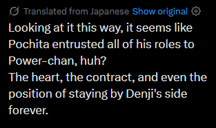 >>286958707>Power back >Makima baited but it's just Nayuta >Power saves DenjiAlmost feels like Fujimoto wrote this chapter to vindictive P specifically