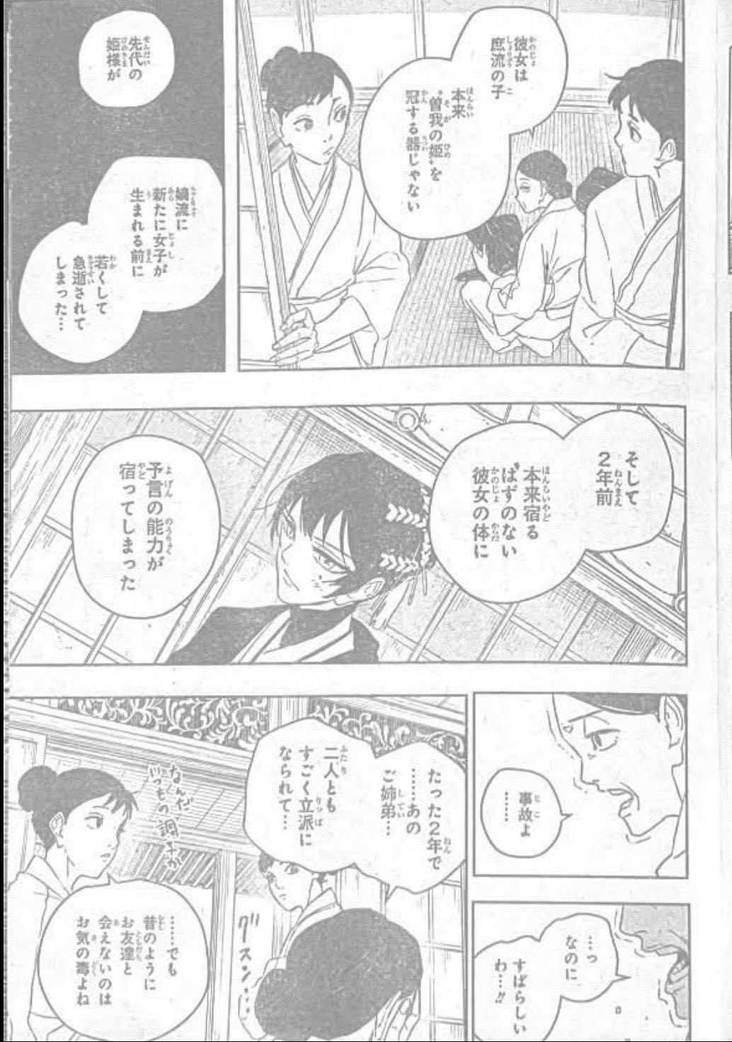Hasumi (thinking): As the head of the sorcery clans, this 'prophecy ritual' where the Soga Clan and government converge, serves to remind them that the bond between human policy and the world of sorcery holds unwavering. This ritual then serves to further the unspoken agreement and