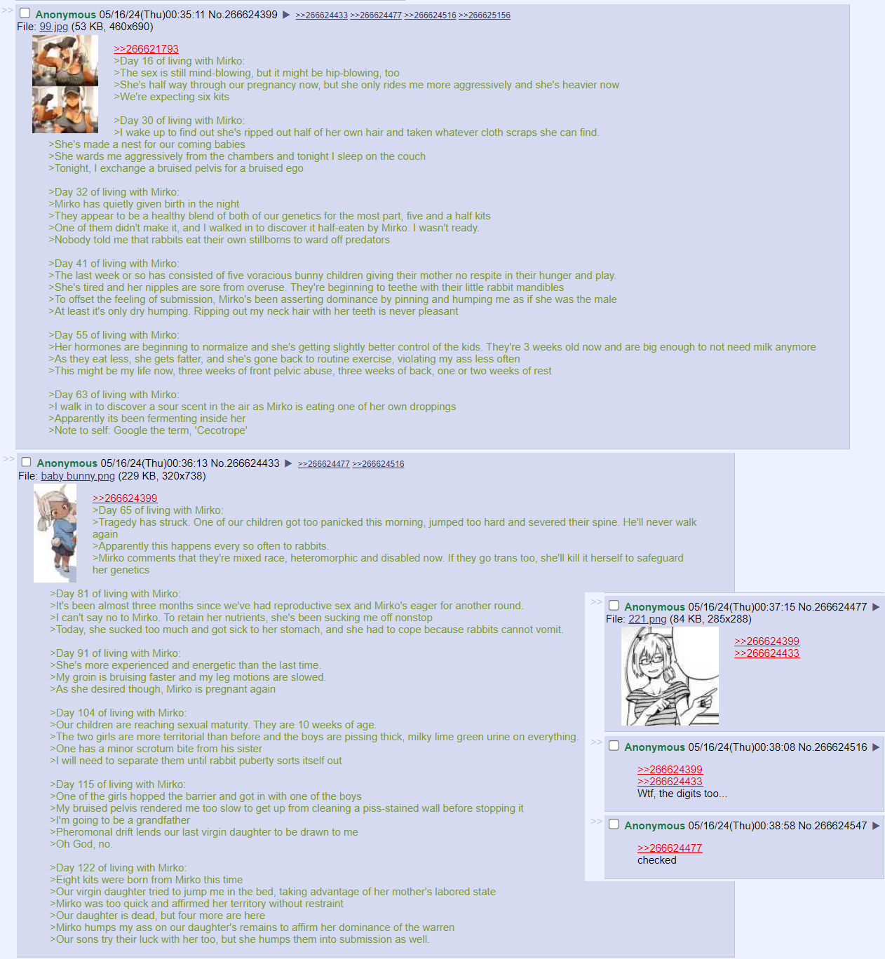 >>287044023>Rabbits typically give birth to4 to 12 kits(baby rabbits) per litter, with an average of about 6, though they can have more.So? How many?