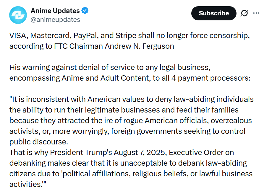 >>287107371No. Because payment processors aren't debanking you, or trying to negatively impact businesses, they're trying to "protect their brand image" and that nonsense isn't listed in this warning.And warnings never do anything, this would need to be passed into law.