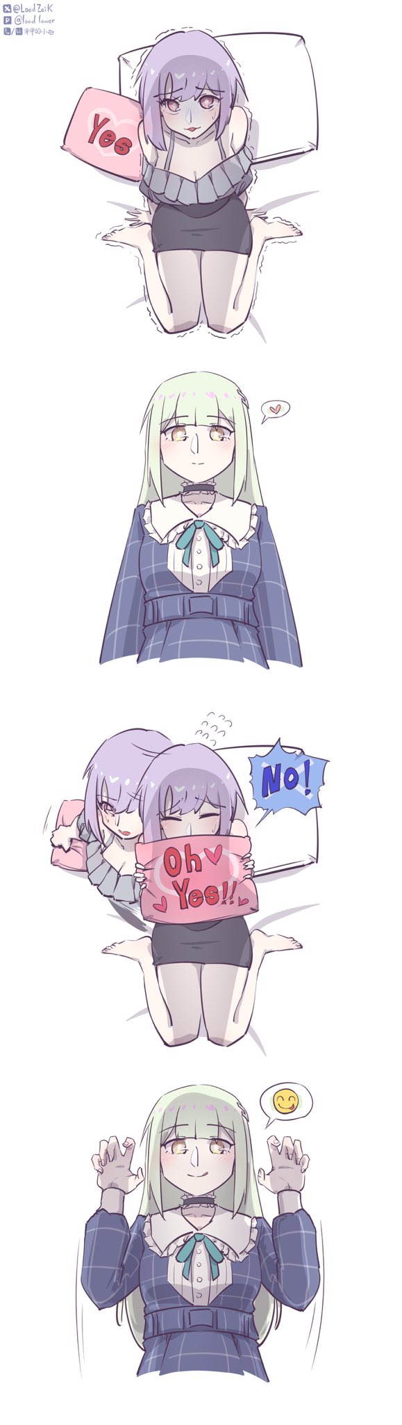>>287088140Cat x either of the two hardasses (Drummer or Keyboard) with the leftover third wheeling (or just both for the cat)Pink x Green (they're confirmed classmates already btw)