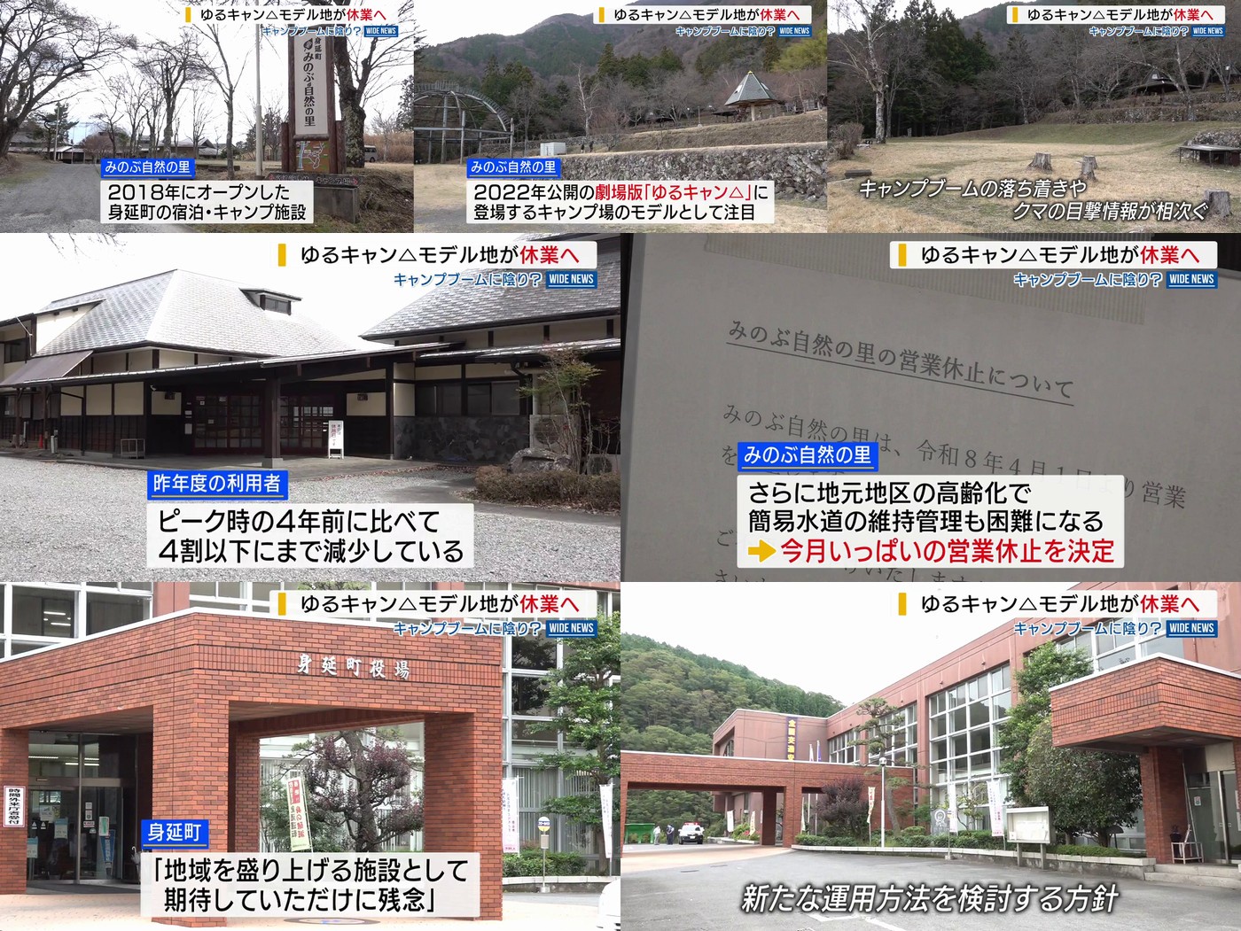 [Sad news] The location that served as the model for "Yuru Camp△" is closing down; is the camping boom fading? "It's a shame, especially since we had high expectations," Yamanashi.https://news.ntv.co.jp/n/ybs/category/economy/ysa9f04cd7e55243faaf4bccc183ce67d6Minobu Nature Village, the campsite that served as the model for the one in the theatrical version of "Yuru Camp△," will be closing its doors at the end of this month due to a decline in visitors and other reasons."Minobu Nature Village" is an accommodation and camping facility in Minobu Town that opened in 2018.It gained attention four years ago when it was featured in the theatrical film "Yuru Camp△" as the model for the campsite.However, due to the decline in the camping boom and a series of bear sightings in the town, the number of users last year fell to less than 40% of the peak number four years ago.Furthermore, the aging population in the local area has made it difficult to maintain the simplified water supply system, and the company responsible for its management has decided to suspend operations at the end of this month.The town stated, "We are disappointed, as we had high hopes for this facility to revitalize the community," and plans to consider new operational methods going forward. Notice Regarding the Suspension of Operations at Minobu Nature Village - Minobu Town Website (Tourism Division)https://www.town.minobu.lg.jp/page/8374.html