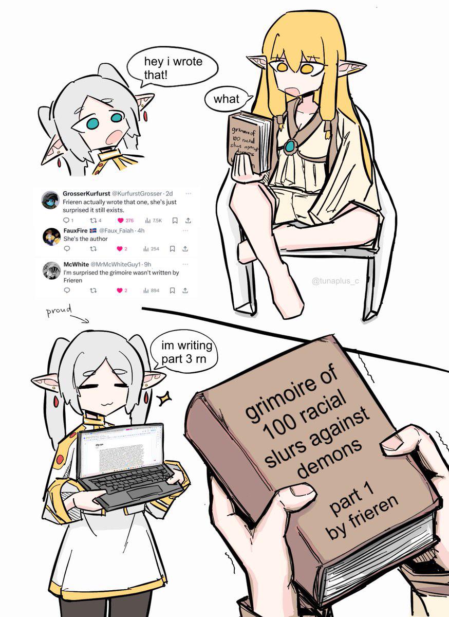 Rereading the Flamme fragments also made me realize something. Demons are cunning, but arrogant and careless when it comes to their mana or magic in general. So they can be tricked by various seemingly cheap moves, most eminently mana concealment.But humans are the same when it comes to words. We're extremely cunning when using communication to get what we want, and we instinctively think that we can tame a demon by just saying the right things. So while demons are much worse at lying than humans or elves (just like other races are worse than demons at magic), they very rarely have subtlely or patience for extended manipulation, they can often make us drop our guard for the critical moment by saying outrageous bullshit they don't even comprehend.I'm saying, demonposters are kindred souls to Aura in a certain way, after all.>>287111295Anon... that's a really bad page to post if you want to prove Frieren contributing something to the evolution of magic by means other than violent conflict. This is exactly what I'm talking about. On the intellectual level Frieren cares about Flamme's ideal of magic available to everyone. On the level of internalized values that actually inform actions, she only contributes to this ideal by engaging in violence to protect it. She doesn't say, spend time to invent a universal statue-cleaning spell that works on any material and then distribute it.>Eventually you will realise you are defeating your own argument the more you try and talk about it.Pot, kettle, black.