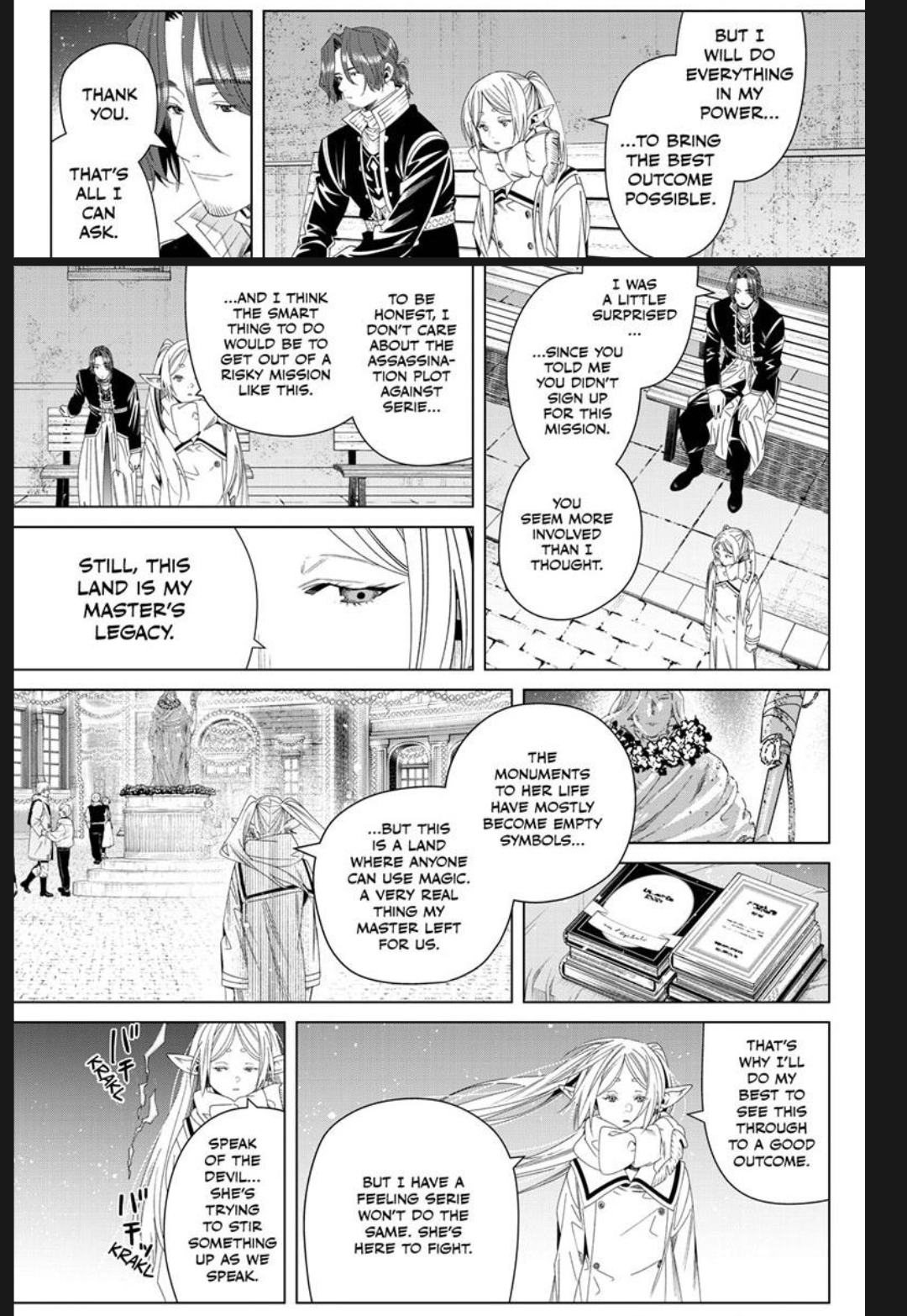 >>287111666>That page doesn't countAgain, pot, kettle, black. You are the one completely ignoring certain pages. I'm the one seeing the wholesome moments of a relationship in their full context.And returning to the starting point. >their entire clash of idealsThere is no such thing. Not only their ideals are identical, Serie is incomparably more willing to work and sacrifice for them. Including her own life. Remember, she could have turned the Empire's capital into a crater and its entire mage corps into corpses, if she took things seriously. She is not doing that for the same reason Frieren wants to prevent the conflict: the Empire is Flamme's legacy. And she is not willing to sacrifice the Mage Association, either. If the author actually wanted to sell us some ideological difference between Frieren and Serie, he did a piss-poor job of it. It is proclaimed in-character, but not shown, and their conflict comes off as a string of women moments on both sides.Now, it IS possible, and, indeed, hinted, that Serie is a lying villain, whose positive emotional connections and quirky facade are real, to an extent, but cannot override her monstrous ego (in such case Macht/Solitar, among their other functions in the plot, foreshadow her nature). Then Frieren's mistrust and dislike of her would turn into the results of her accumulated wisdom, allowing her to correctly suspect Serie and guess parts of her motives even before the latter's true nature is fully revealed. But so far it did not happen.